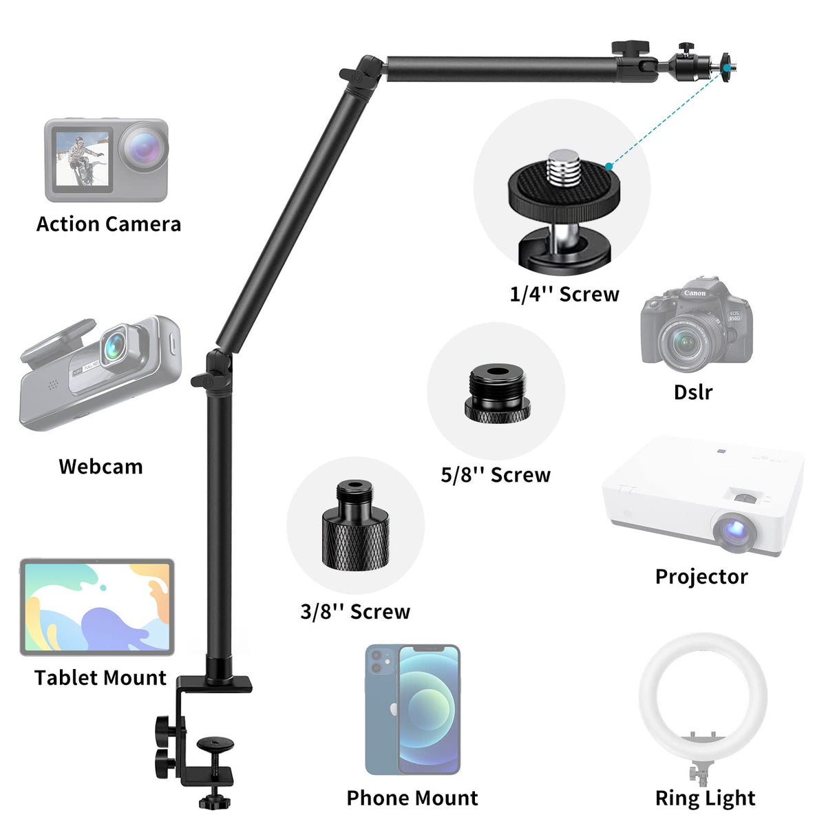 Desktop C-Clamp Stand Top With 1/4'' Thread, Come With Ball Head And A 1/4 Hot Shoe Interface Adapter (Removable). And Asy To Install Microphone, Led Video Light, Monitor To Dslr, Camcorder Or Digital Camera, Flash Remote Trigger Or Adapt Anything Via The 1/4'' Screw On The Top Of The Mount. | ?Adjustablement With Locking Knob?Adjustable Desktop C-Clamp Stand: The Size Height Could Be Extended From 13.39 To 35.43 Inch As You Like. The Ball Head Can Ensure 360 Degree Horizontal Rotating And From -90 Degree To 90 Degree Tilting For Panoramic Photography When Adjusting The Angle. You Can Use The Knob To Adjust To The Desired Angle To Meet Your Needs At Different Angles. | Made Of Highly-Durable Aluminum-Alloy Material With Stainless Steel, Using A More Stable Structure. The Hot Shoe And C Clamp Clip With Rubber-Padded Mount On The Top To Protect Your Equipment Or Table From Potential Scratches Between Your Camera And The Mounting Part. | ?Flexible Position?With Its Solid-Metal Clamps, Adjustable And Sturdy Stand. Mounts To The Back Of Your Desk (Range From 0.5 To 2.23'' Thickness) Via A Heavy-Duty C-Clamp Or Optional Grommet Mount. Our Desk Mount Stand Can Be Adjusted To Any Thickness Within Seconds As Needed. | ?Package List And Service?1*3/8'' Screw, 1*5/8'' Screw, 1*Ball Head, 1*Hot Shoe, 1* Phone Holder, 1*Desk Light Stand, Magic Arm Or Gooseneck. Welcome To Send Email To Us When You Have Questions.