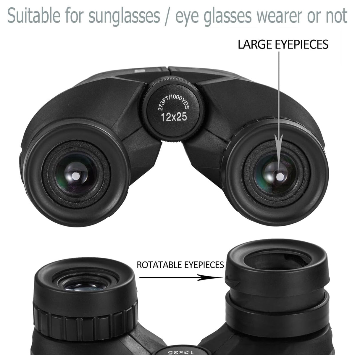 Feature: A Real Color Reproduction, No Color Distortion Under Multi-Coated Lens This Binoculars Can Be Used For Night Vision With Some Light But Not For Completely Dark Night Brighter, Not Eye Strain, With A High Transmittance Of 99% Large Eyepiece, Smooth Center And Right Eye Focus Knob Provides Easy Yet Precise Focal Adjustment Two Adjustable Rotating Goggles Eyepiece Can More Focus On The View And More Fit For The Glasses Wearer Multi-Use In Hunting, Hiking, Exploring, Viewing, Traveling, Bird Watching, Concert, Opera, Football Games, Outdoor Sports Etc Specifications: Model:12X25 Objective Lens Diameter: 25Mm Eyepiece Diameter: 15Mm Near Focal Distance: 5M Exit Pupil Distance: 20Mm Objective Lens Coating: Fmc Broadband Focus System: Center And Right Eye Prism System: Bak4 Prism Angle Of Field: 7 5A Field Of View: 273Ft1000Yds Weight Of Binoculars: 0 65 Pounds Item Dimensions: 400X 440X190 Inches Waterproof Grade: Life Waterproof Package Included: Binoculars*1 Carrying Bag*1 Glass Cleaning Cloth*1 Skid-Proof Rope*1
