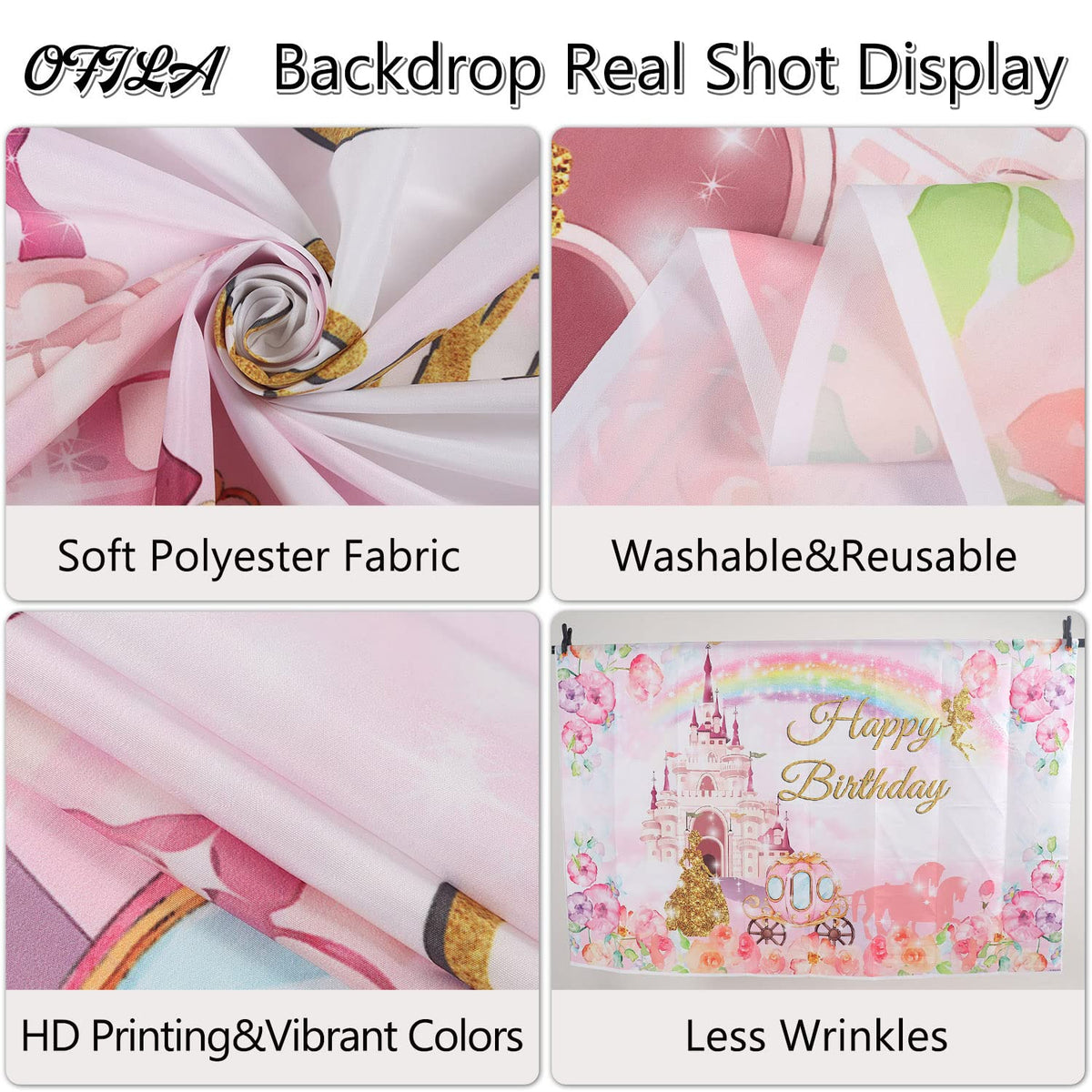 Q: What occasions is this backdrop suitable for?A: The OFILA Princess Castle Birthday Backdrop is perfect for various occasions, including birthday parties, baby showers, weddings, graduations, and can also be used for home decor.