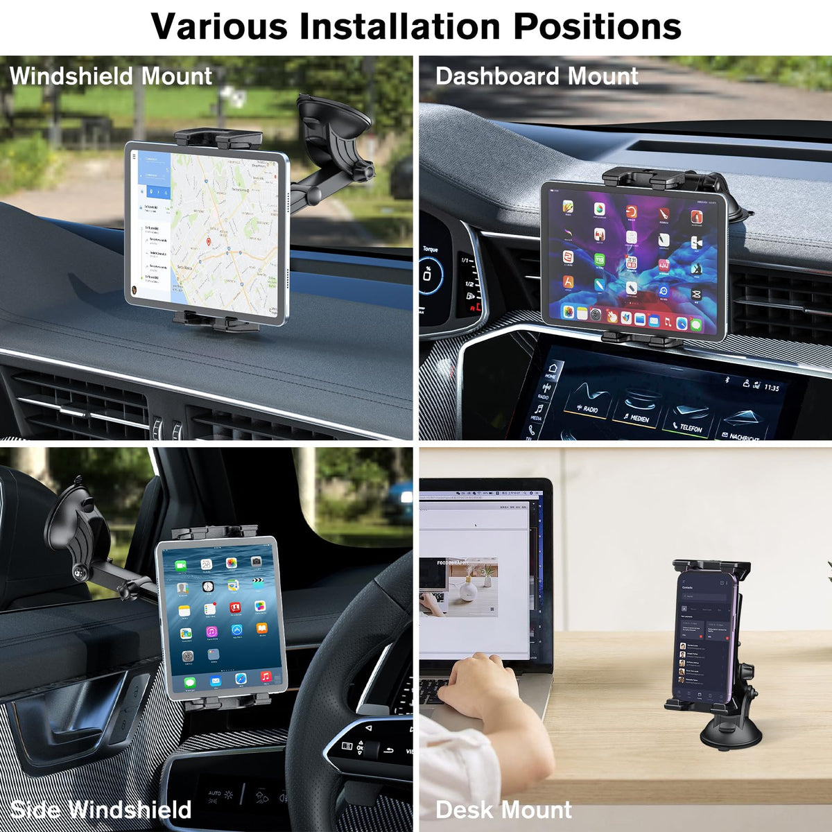 Features: The Tablet Holder For Car Is Designed For Tablets From 5 Inches To 13 Inches. The Ipad Car Mount Has A Super Strong Suction Cup On The Bottom And A Quick Release Switch On The Back. Tablet Mount For Car Allows You To Get Closer To Your Tablet And Mount It On Uneven Car Dashboards. Simply Press The Vacuum Lock Button On The Ipad Mini Car Mount, And The Suction Cups Will Be Securely Fastened To The Dashboard And Windshield. The Ipad Holder For Car Has A 360� Swivel Function And A Rotating Ball So You Can Get Any Angle You Want.