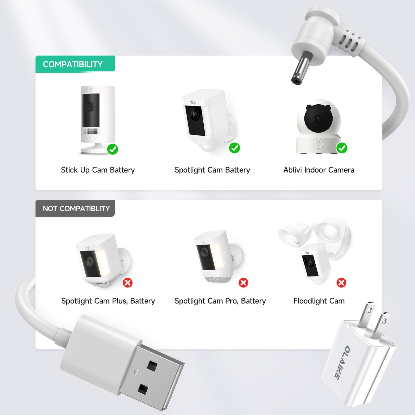 Olaike Indoor/Outdoor Power Adapter For Ring Stick Up Cam Battery/Plug In, Ring Spotlight Cam Battery, Weatherproof Cable(5M/16F