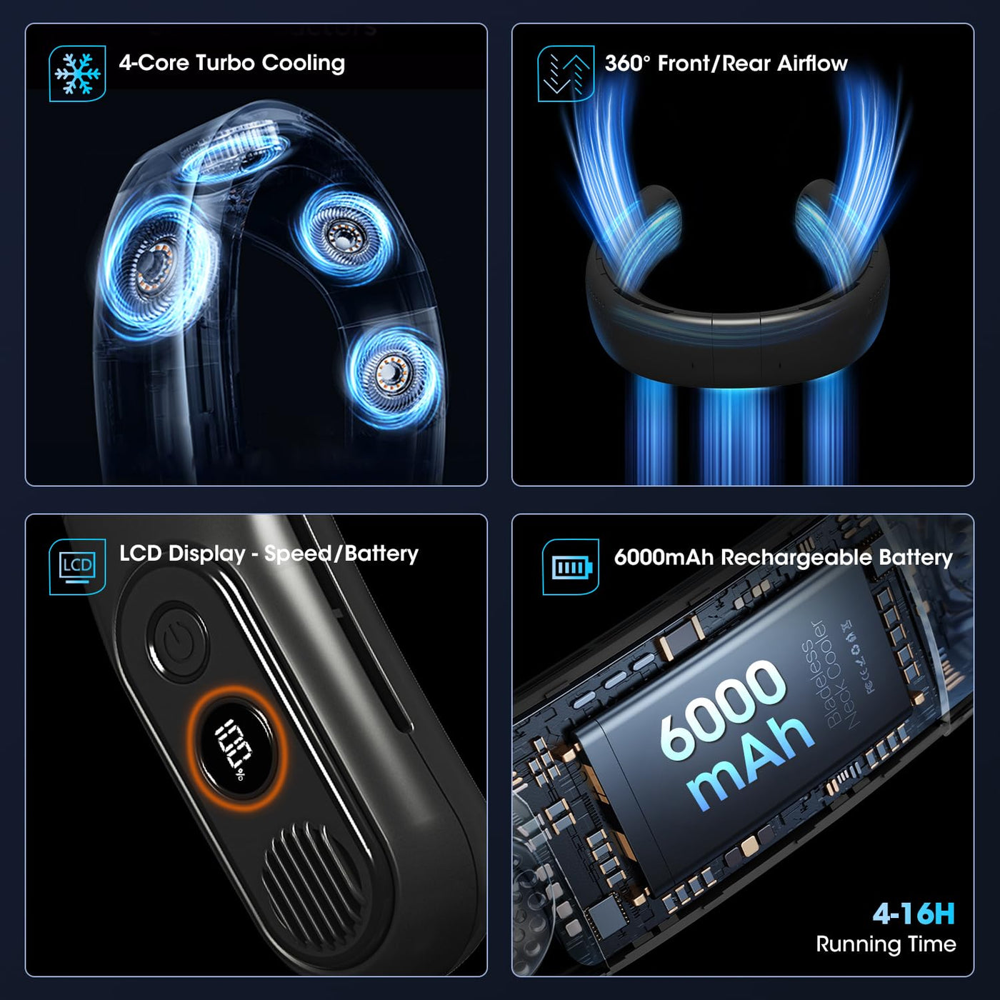 Portable Neck Fan Rechargeable 6000Mah 4 Turbo Motor Powerful Airflow
