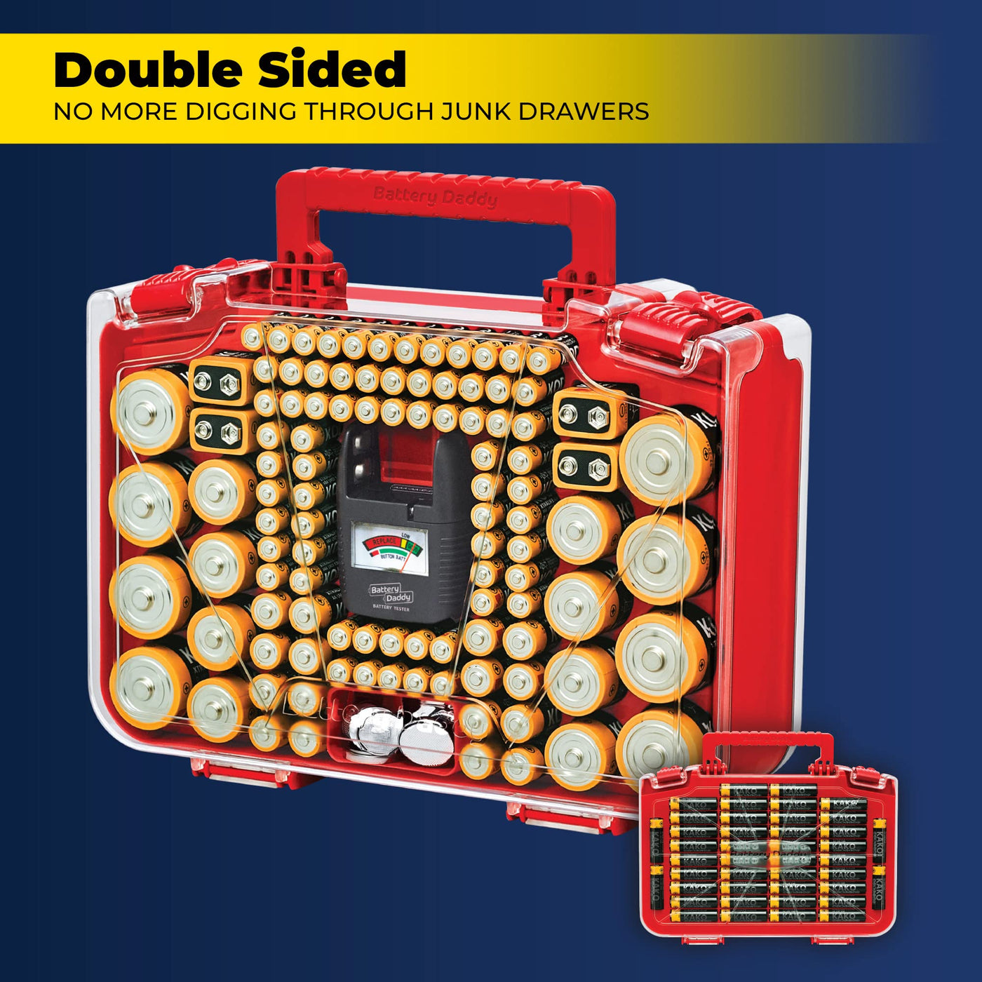 Q: Does the Battery Daddy come with a battery tester?A: Yes, the Battery Daddy includes a built-in battery tester that allows you to check the status of both single-use and rechargeable batteries easily.