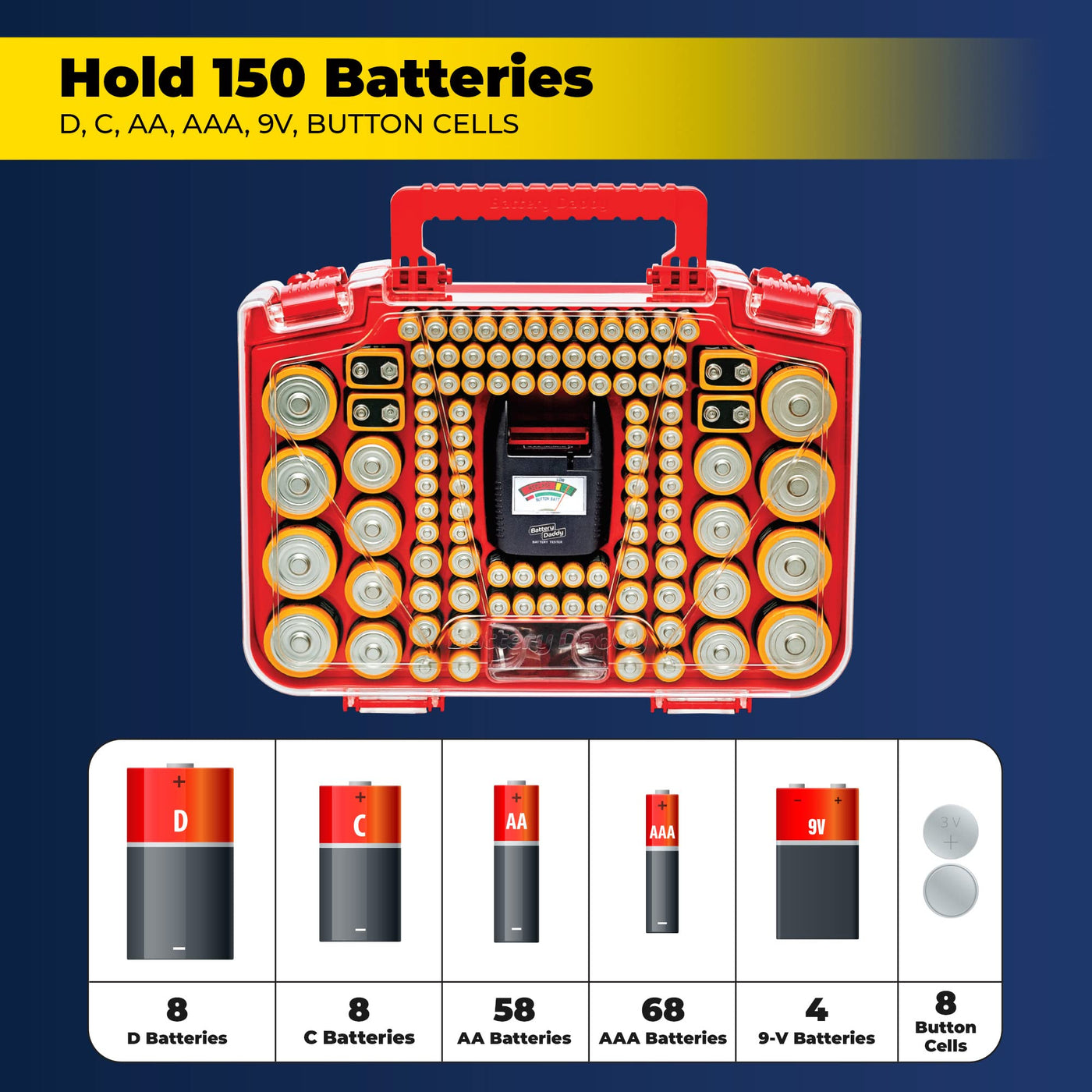 Q: How many batteries can the Ontel Battery Daddy Smart hold?A: The Ontel Battery Daddy Smart can store and protect up to 150 batteries, including 58 AA batteries, 68 AAA batteries, 4 9-volt batteries, 8 C batteries, 8 D batteries, and 8 button cells.