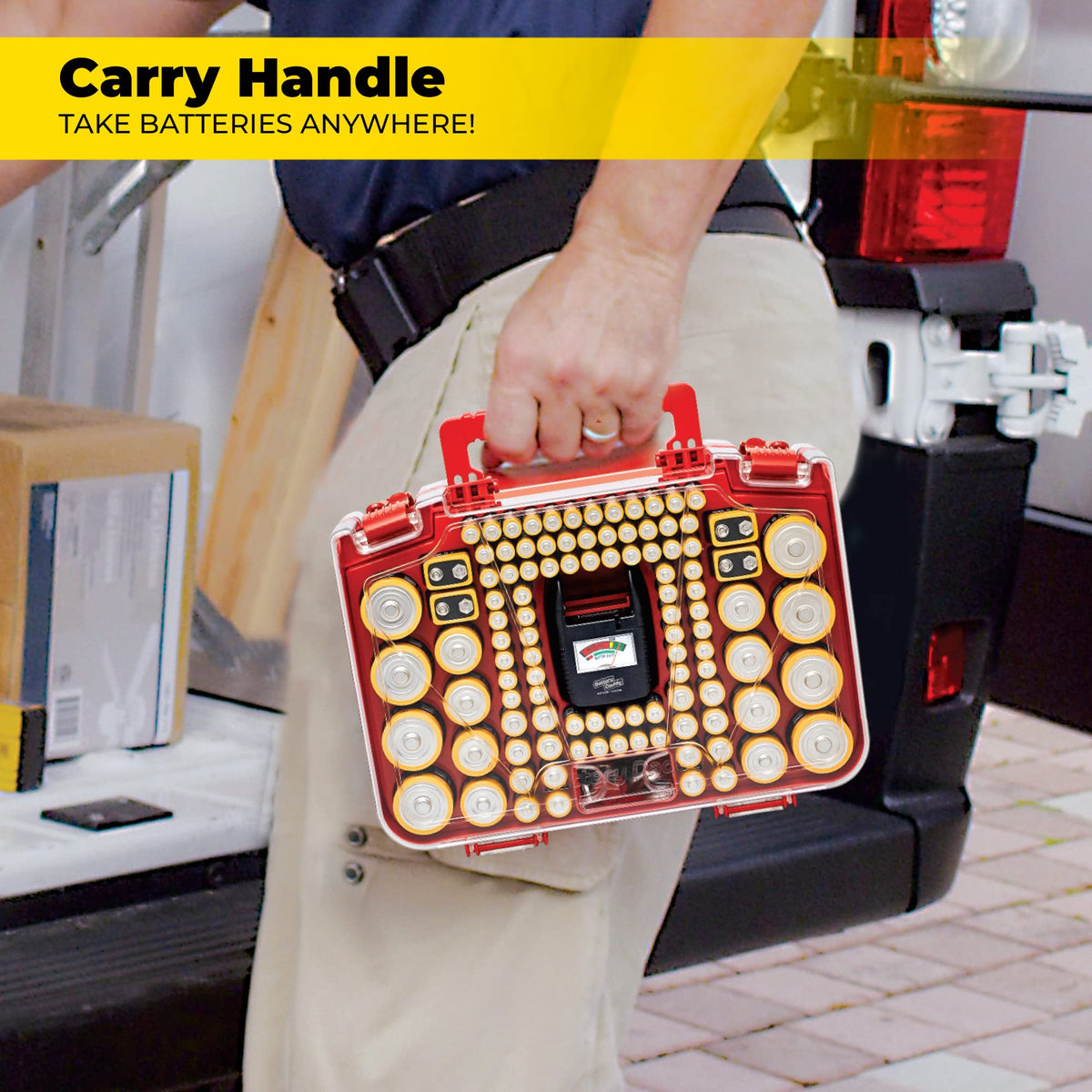 Q: What materials is the Battery Daddy made from?A: The Battery Daddy is designed with a clear locking lid for visibility and protection, though specific material details are not disclosed.