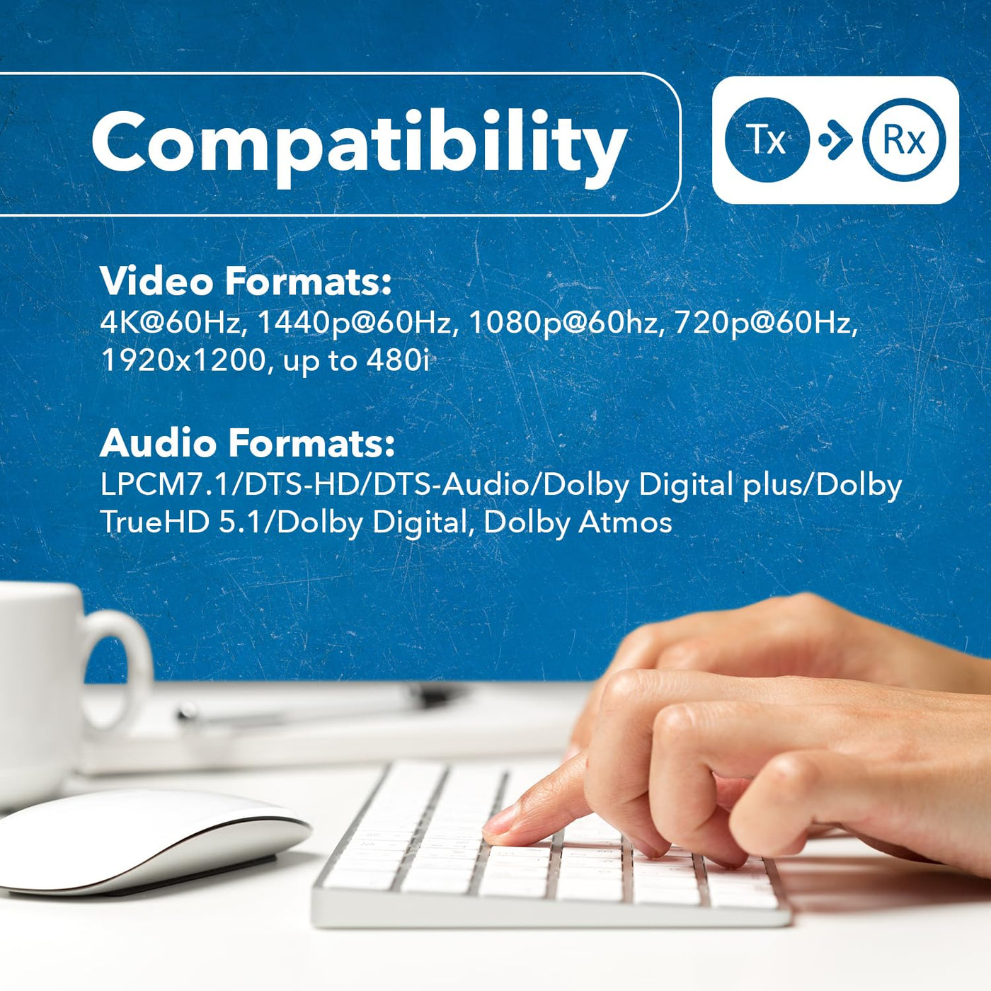 Q: What kind of audio formats does this device support?A: The OREI 4x1 KVM HDMI Extender supports various audio formats including PCM, LPCM, DTS HD, and others, allowing for rich sound output through 3.5 mm audio ports.