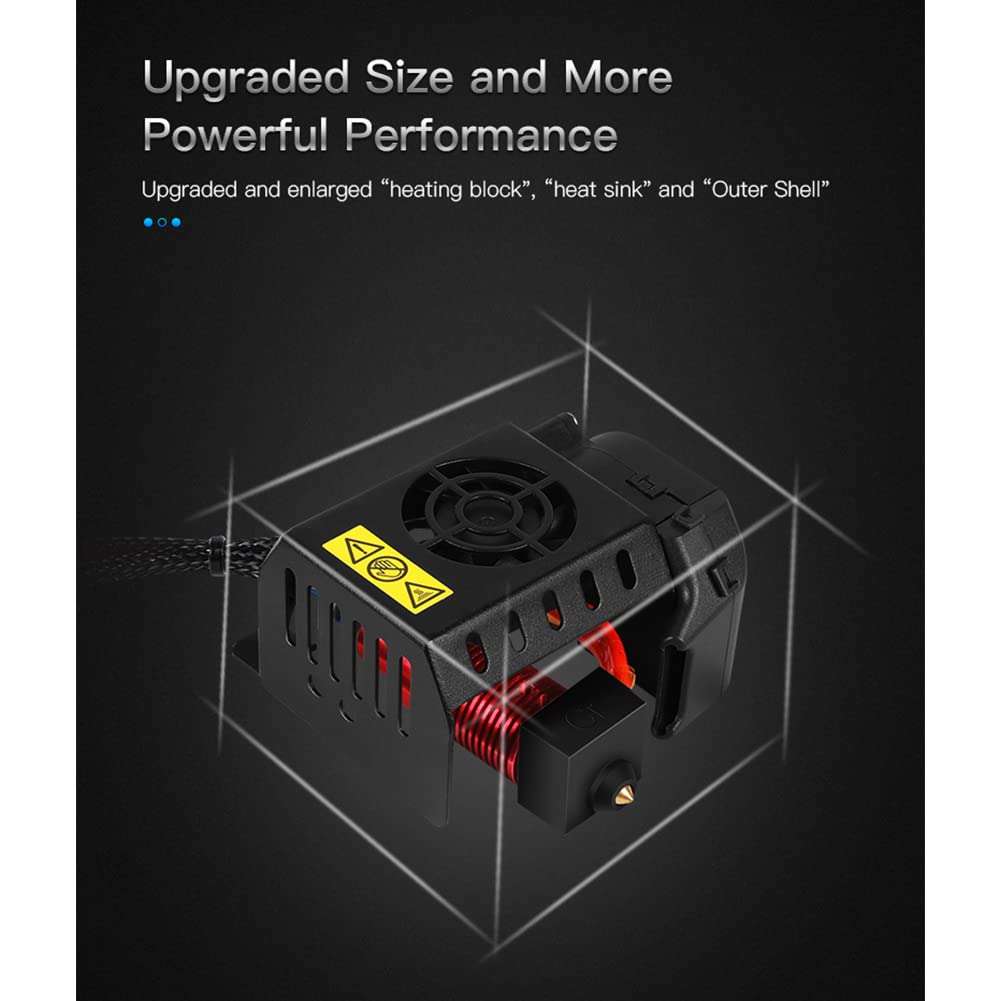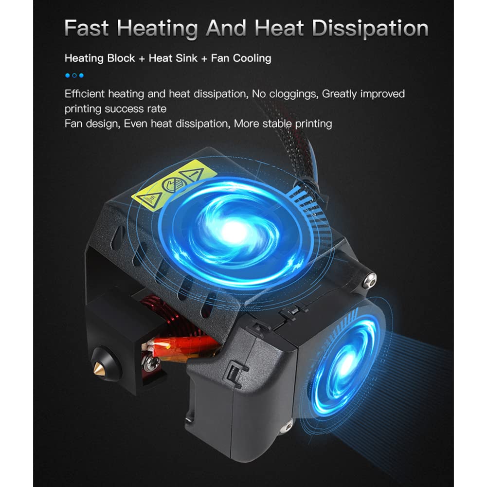 Q: How does the upgraded heating block and heat sink improve printing performance?A: The upgraded heating block and heat sink provide more powerful performance, ensuring efficient heating and heat dissipation. This design minimizes clogging issues and significantly improves the printing success rate.