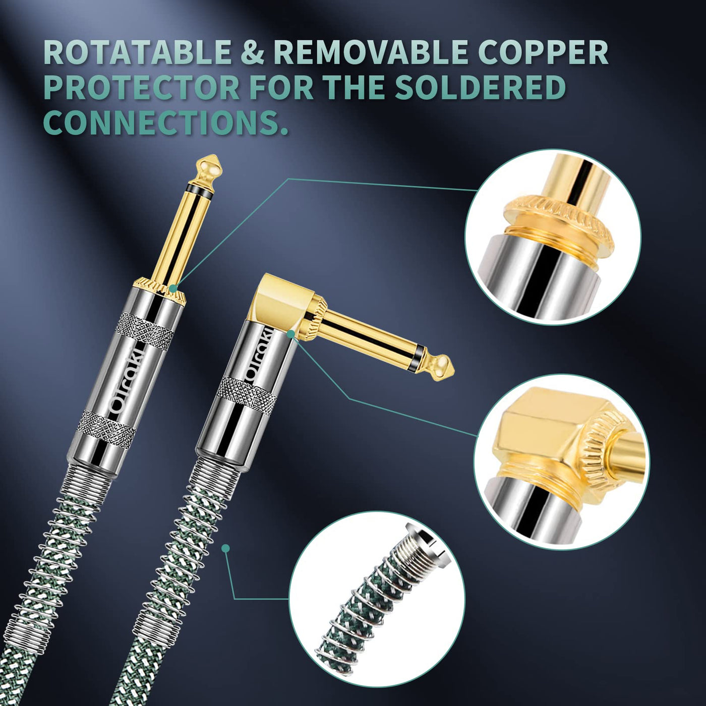 Q: What makes the connectors of this guitar cable different from others?A: The connectors of the OTraki guitar cable feature a gold-plated 6.35mm design, offering higher conductivity and anti-oxidation properties. The zinc alloy metal shell ensures a tight connection, while the rotatable feature allows for easy adjustment.