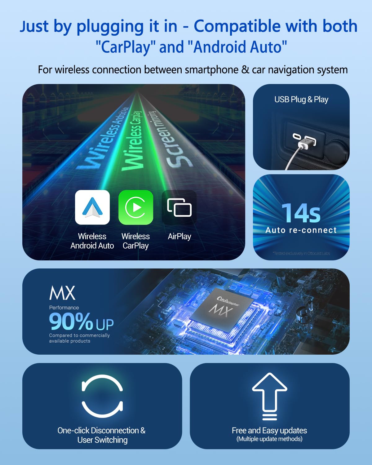 Ottoadapter Mx Wireless Carplay Android Auto Adapter With Airplay, 3 In 1 Car Dongle 2024 Upgraded Dual Channel Direct Connectio