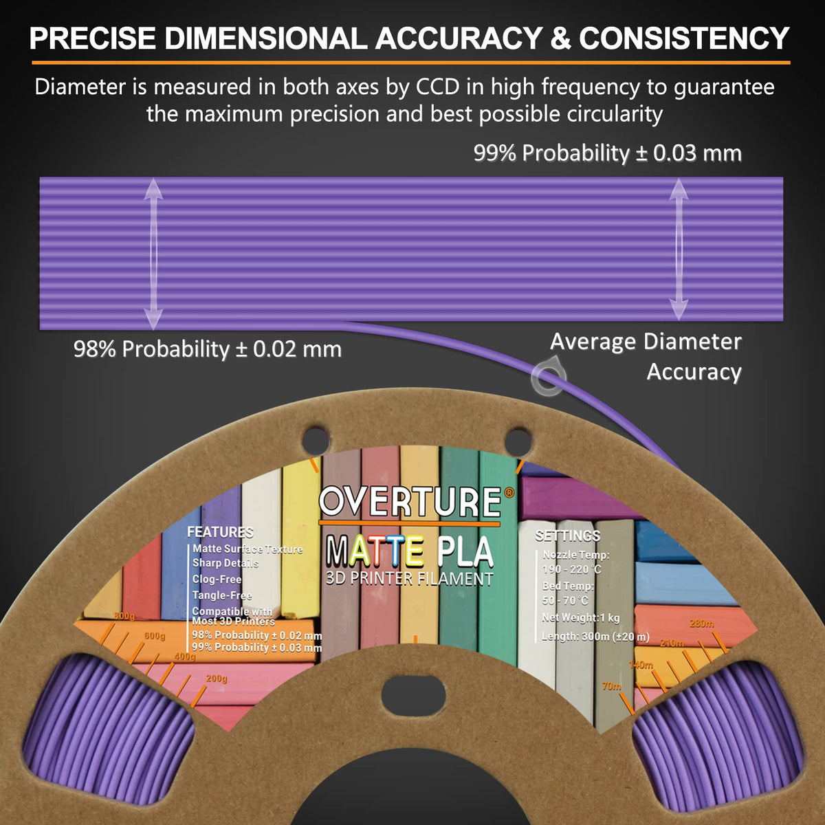 Q: What is the dimensional accuracy of OVERTURE PLA Matte Filament?A: OVERTURE PLA Matte Filament has a dimensional accuracy of +/- 0.03 mm, ensuring precise and consistent prints for high-quality results.