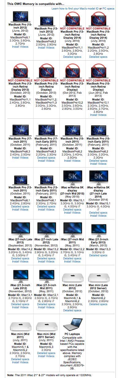 Owc 8Gb (2 X 4Gb) Pc12800 Ddr3L 1600Mhz So-Dimms Memory Compatible With 2011-2015 Imac, 2011-12 Mac Mini, And 2011-2012 Macbook Pro (Non-Retina Display) Models Product Specs: Technology: Ddr3L So-Dimm Density: 4Gb (4096Mb) Per Module Rohs: Yes Pin Count: 204-Pin Op. Temp.: 0C To +85C Data Rate: Ddr3L-1600 Speed: Pc3-12800 Cl: 11 Cycle Time: 1.875Ns Voltage: 1.35V Ecc: Non Ecc Module Ranks: Dual Rank Register: Non Parity Low Noise 8-Layer Pcb Meets And/Or Exceeds /Intel Specifications Fully Compliant With Jedec Specifications Rohs Certified Warranty Safe Upgrade. Compatible: Macbook Pro 17-Inch (2011 Model Id: Macbookpro8,3) (Early 2011 Model Id: Macbookpro8,3) Macbook Pro 15-Inch (2011 Model Id: Macbookpro8,2) (Early 2011 Model Id: Macbookpro8,2) (2012 Model Id: Macbookpro9,1) Macbook Pro 13-Inch (2011Model Id: Macbookpro8,1) (Early 2011 Model Id: Macbookpro8,1) (2012 Model Id: Macbookpro9,2) Imac W/Retina 5K Display 27-Inch (Mid 2015 Model Id: Imac15,1) (Late 2014 Model Id: Imac15,1) Imac 27-Inch (Late 2013 Model Id: Imac14,2) (Late 2012Model Id: Imac13,2) (Mid 2011 Model Id: Imac12,2) Imac 21.5-Inch (Early 2013 Model Id: Imac13,3) (Late 2012 Model Id: Imac13,1) (Mid 2011 Model Id: Imac12,1) Mac Mini (Late 2012 Model Id: Macmini6,1 & Macmini6,2) (Late 2012 Server Model Id: Macmini6,2) (Mid 2011 Model Id: Macmini5,1 & Macmini5,2) (Mid 2011 Server Model Id: Macmini5,3) Pc Laptops: Compatible With Intel / Amd Process Based Pcs Capable With The Specifications Listed Above. Memory Complies With Jedec Specifications, Document Jesd79-3B. This Owc Memory Is Not Compatible With Macbook Pro 13-Inch Retina Display (2014 Model Id: Macbookpro11,1) (2013 Model Id: Macbookpro11,1) ( 2012, 2013 Model Id: Macbookpro10,2) Macbook Pro 15-Inch Retina Display (2014 Model Id: Macbookpro11,2) (2013 Model Id: Macbookpro11,2; Macbookpro11,3) (2012, 2013 Model Id: Macbookpro10,1)