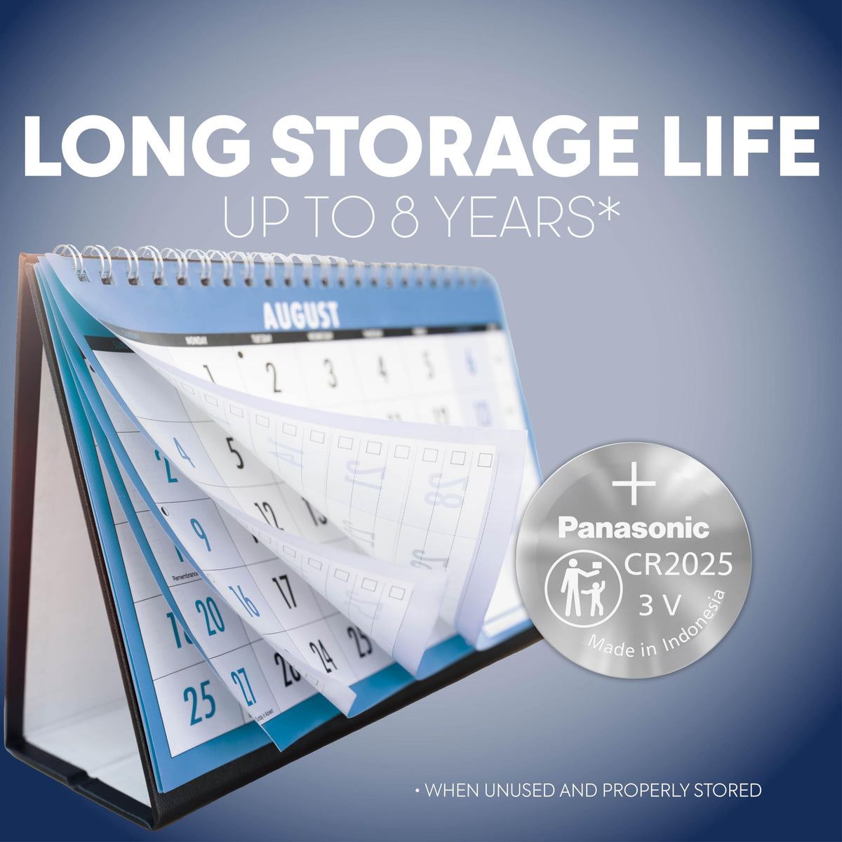 Q: How long do Panasonic CR2025 batteries last?A: These batteries offer a long shelf life of up to 8 years, ensuring reliable power when you need it for your devices.