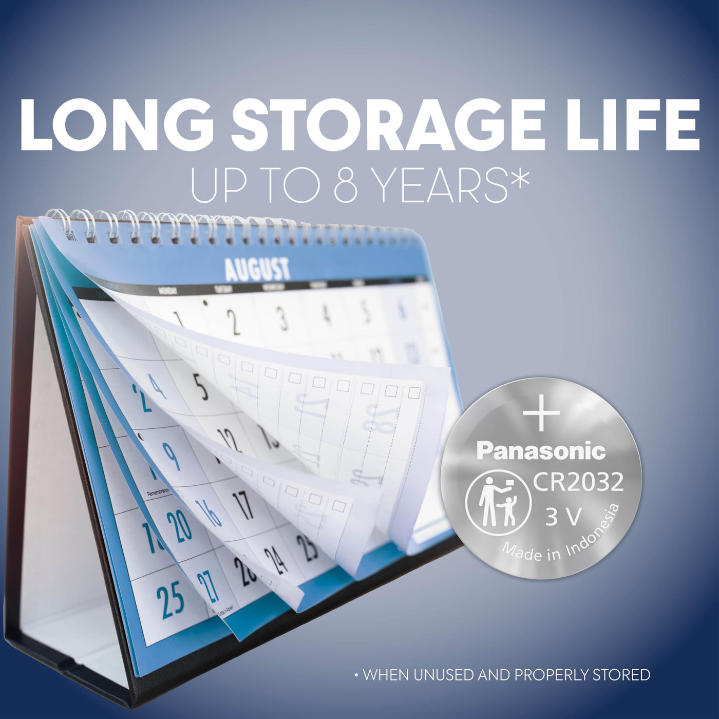 Q: What is the shelf life of Panasonic CR2032 batteries?A: These batteries have a long shelf life of up to 8 years, ensuring you have reliable power when needed.