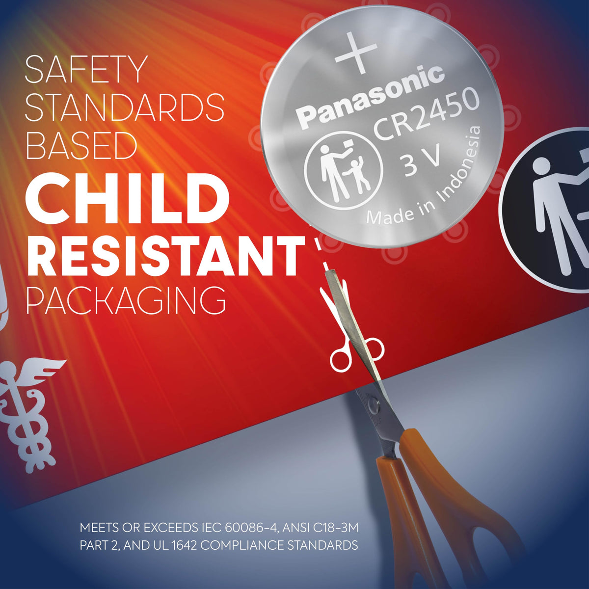 Panasonic Cr2450 3.0 Volt Long Lasting Lithium Coin Cell Batteries In Child Resistant, Standards Based Packaging, 4-Battery Pack