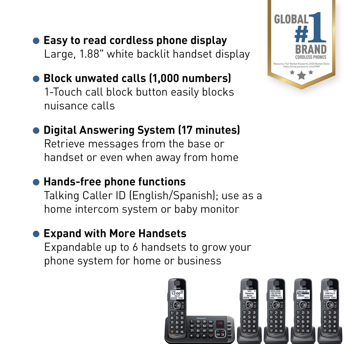 Panasonic Cordless Phone Kx-Tge645M Has Features That Are Easy To Use And Help Keep You Free From Nuisance Calls. This Phone Is Exceptionally Easy To Find, Even In Low Light, With An Illuminated Keypad (1.8 Inch Monochrome Full Dot Display On Hand Set). Automated Call Block Helps Keeps You Free From Spam Calls, With The Extra Protection Of Prompting The Caller For An Access Code, And Disconnecting Any Spam Calls Automatically. A 1-Touch Call Block Button Lets You Block Unknown Numbers Easily By Simply Pressing A Button On The Handset. Bilingual Talking Caller Id Lets You See And Hear Who'S Calling Before You Answer The Call (In English Or Spanish). If You Need To Go Hands-Free, This Phone Can Be Used As A Full Duplex Speakerphone Or Set Up As A Home Intercom System Or Baby Monitor, Giving You The Freedom To Keep An Eye On Baby And Communicate With Your Family While You'Re Focused On Work Or Making Dinner. Use The Speed Dial Function For 1-Touch Access To Your Most-Dialed Numbers. With Long Battery Life, This Phone Lets You Enjoy Up To 10 Hours Of Talk Time And 5 Days Of Standby Time. Caller Id (50 Items) Lets You Screen Calls Effectively, While A 100-Entry Phonebook Memory Ensures You Can Quickly Make The Calls You Want. 5 Cordless Handsets Included.