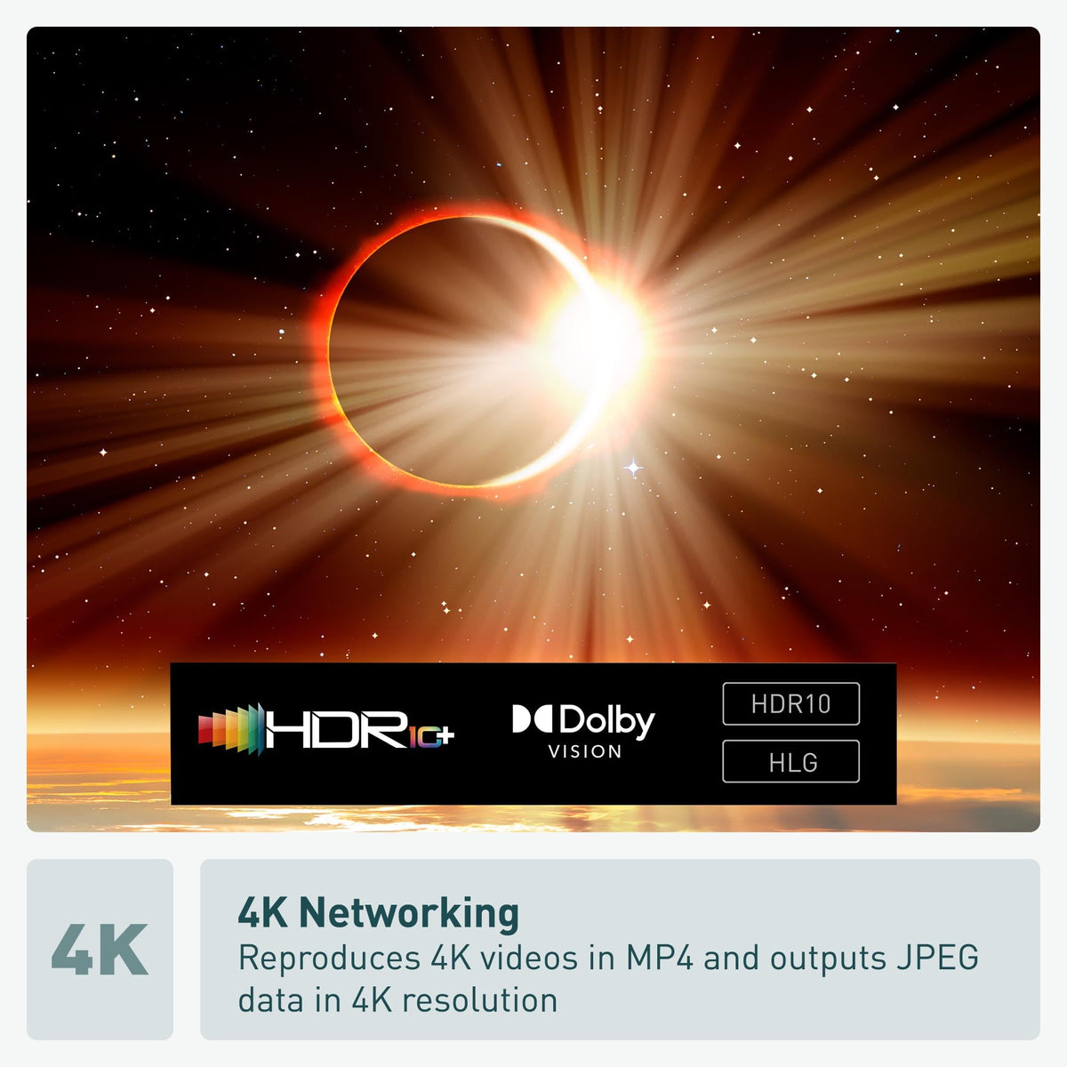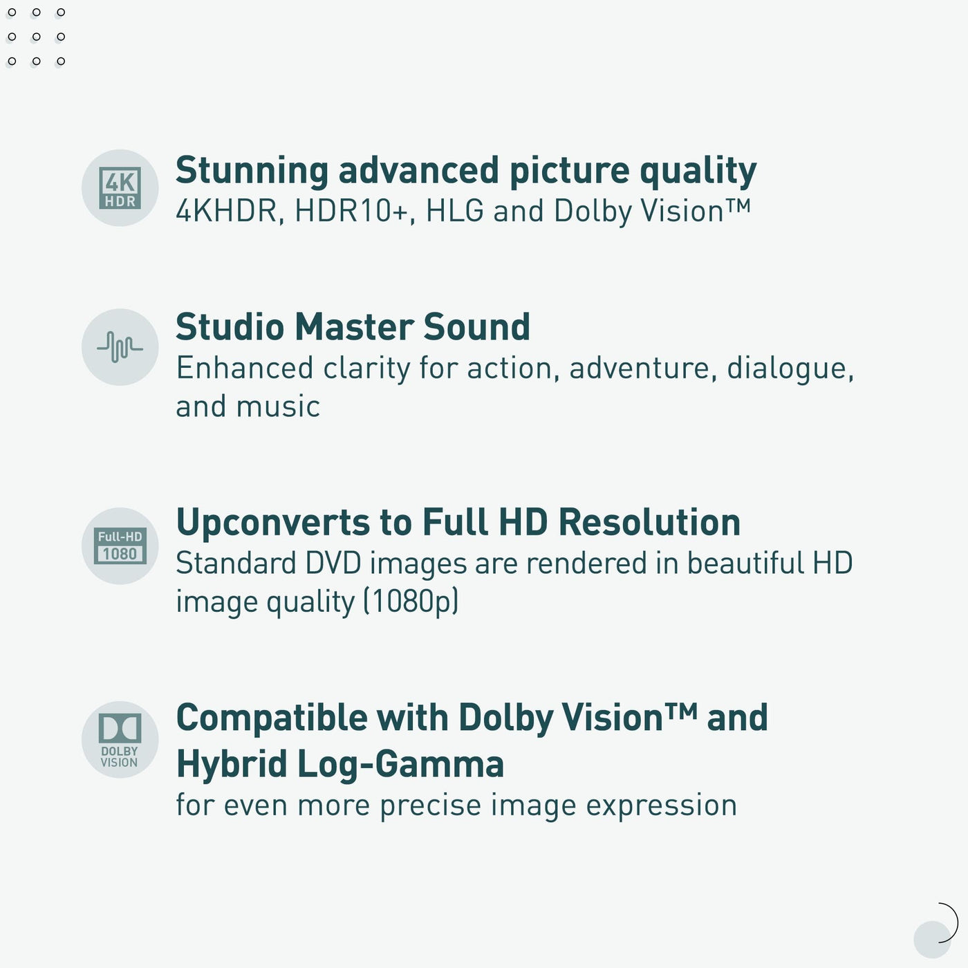 For A Cinematic Experience At Home, The Premium 4K Blu Ray Player (Ub450) Delivers Stunning Color And Details For Blu Ray Dvds, Applying Exclusive Panasonic Technologies To 4K High-Precision Chroma Processing To Give Natural Textures And Depth, Maximizing Their Color, Clarity, And Beauty. Compatible With Advanced Hdr Standards Such As Hdr10+ And Dolby Vision. Supports High-Resolution Audio Playback To Complete The Cinematic Experience Of Your Favorite Movies, Shows, And Rarities