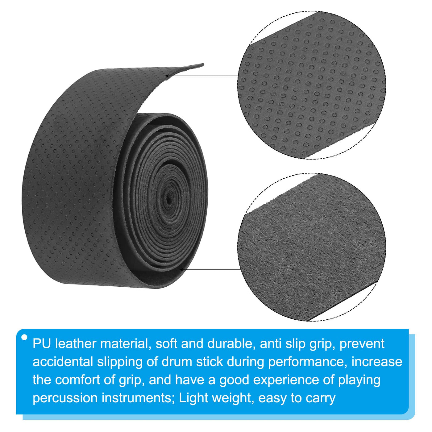 What Is This?This Drum Stick Tape Can Effectively Protect The Handle Of The Drum Stick And Provide A Good Drum Playing Experience. Suitable For Various Percussion Instruments. For Performing In Cafes, Concerts, Bars, Daily Exercises, And Other Occasions.What Will I Get?Drum Stick Tape, Is In Size Of : 25Mm/1-Inch Width, 1M/3.3Ft Length, 0.5Mm/0.02-Inch Lengthin The Package Of: 4Pcs X Drum Stick Tapeis There Any Advantages Of The Product?Pu Leather Material, Soft And Durable, Anti Slip Grip, Prevent Accidental Slipping Of Drum Stick During Performance, Increase The Comfort Of Grip, And Have A Good Experience Of Playing Percussion Instruments; Light Weight, Easy To Carryhow To Use It?Steps Of Installation: 1. Select The Drum Stick Tape Of Appropriate Specification; 2. Remove The Drum Stick Tape To Be Replacedwhat Should I Notice?Please Select The Appropriate Size Of Drum Stick Tape