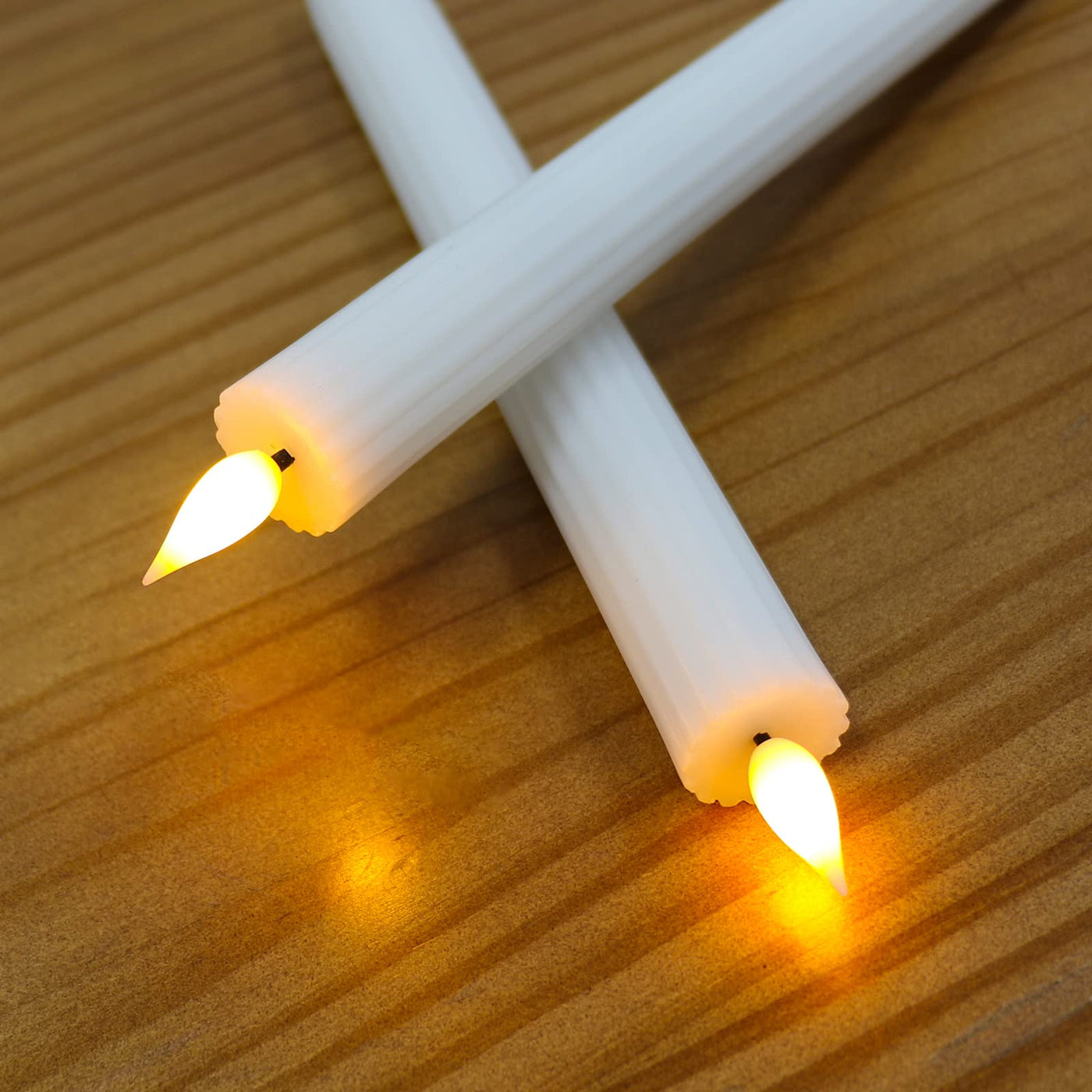Pchero 3D Flame Real Wax Flameless Taper Candles With Remote & Timer & Dimmer - (Set Of 4) * Base Color: Pearl White * Light Color: Warm Yellow * Main Material: Led+Wax * Dimensions: 0.78''(2Cm)D X 9.6''(24.5Cm)H * Light Mode: Steady Light And Flickering Flame * Power Source: 2 * Aaa Batteries Per Candle (Not Included) * Working Timer: 400+ Hours In Flickering Mode * Remote Functions: 2/4/6/8 Hours Timer, Steady Light/Flickering Flame, Brightness Adjustable Pure White Strips - Made Of Real Wax, Dressed In A White Striped Outfit, With 3D Candle Wick On Her Head, And Cake Cup-Like Shoes Under Her Feet, A Romantic Warm Yellow Light Danced In The Wind. Safety For Family - You Can Enjoy Unscented Tapered Candles In Your Home Without The Worry Of Fire Hazards And Messy Dripping Wax. Perfect For Use Around Pets And Kids. Convenient Remote - (Flickering Modes, Brightness, Timer, On/Off), All These Functions Have Already Built In The 10-Key Remote, One Button Pressed, All Candles Are Set. As Christmas Window Candles - Turn Up The Brightness To The Max, Place Them In Holders Or Just Use The Suction Cups, They Will Become Perfect Holiday Window Candles. As Funny Halloween Decoration - White Flameless Candles Paired With Black Or Vintage Candle Holders Are Better For Halloween Decorations. Hang It On Or Place It On Candleticks. As Romantic Wedding Decoration - Pearl White Led Taper Candles Emit Realistic Candlelight, Delicate Enough To Decorate A Romantic, Long-Awaited And Moving Garden Wedding.