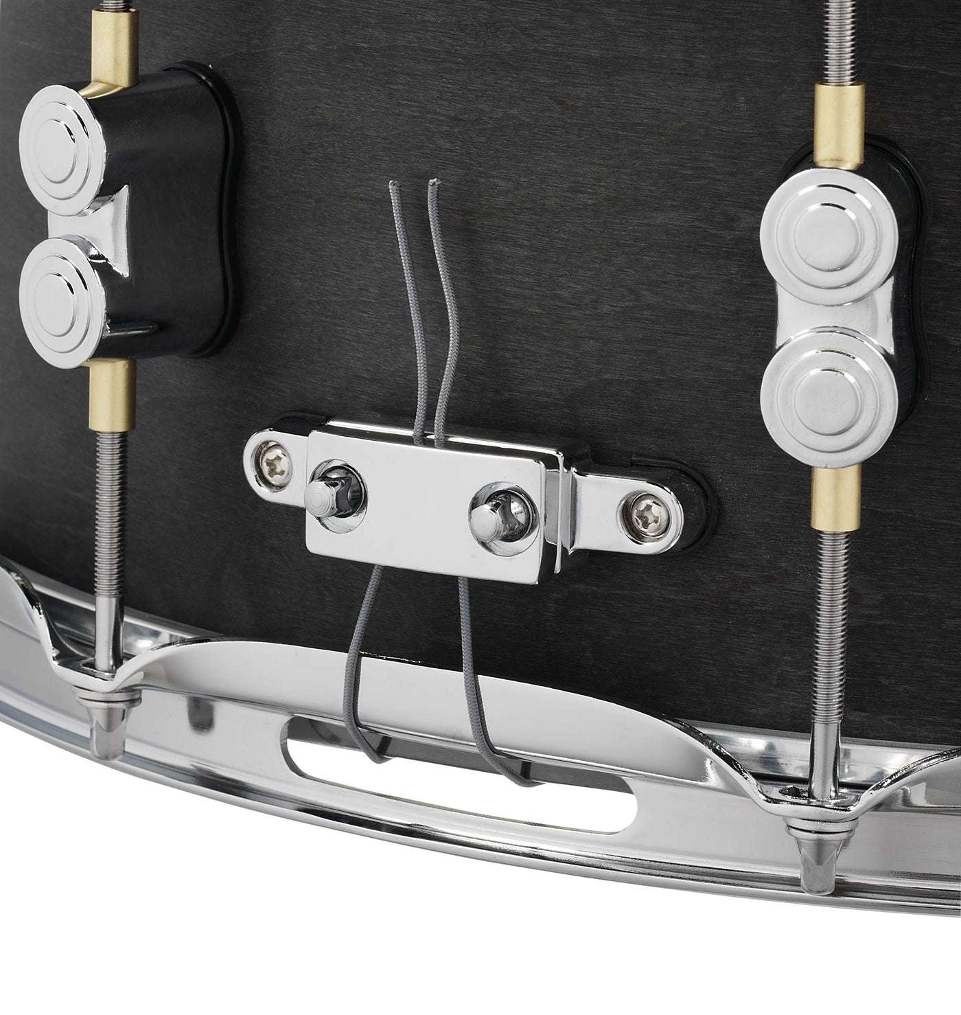 Q: What materials are used in this snare drum?A: The snare drum features a ten-ply maple shell and brass inserts. The matte black finish is achieved with a hand-applied wax-based sealer.