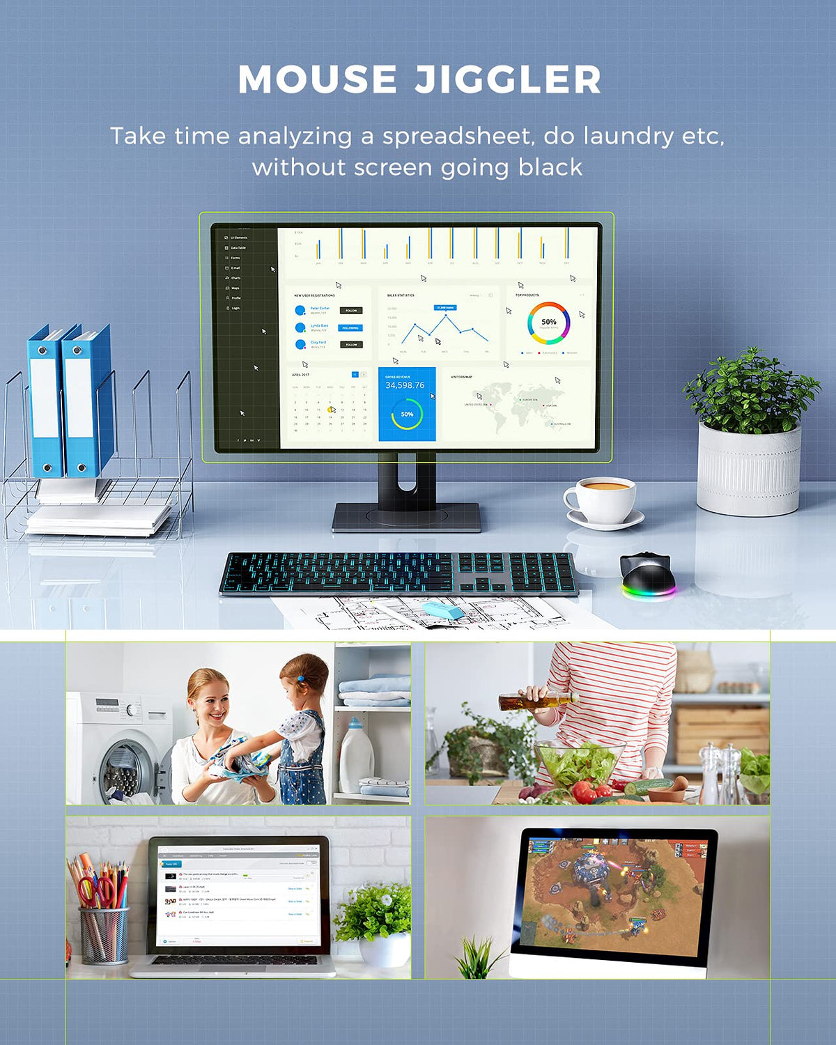 Keeps Computer From Locking Automatically If You Have A Computer That Signs You Out After No Activity Of Few Minutes And You Are Tired Of Having To Log Back In, This Led Mouse Featuring With Jiggler Mouse Mode Does The Trick. Pc Stays Logged In All Day Until You Ready To Turn It Off. If You Work From Home, Then You Definitely Need This In Your Life! How To Use It: For Wireless Mouse: >> Turn The Power Switch On; >> Pull Out The Usb Receiver And Plug It To Your Computer(Usb Receiver Could Be Found On The Back Of The Mouse); >> The Mouse Is Ready! (Press The Led Control Button To Choose Your Favorite Light). For Jiggler Mouse: >> Press The Dpi Button For 3 Seconds; >> The Green Light On, Entering Jiggler Mouse Mode; >> Enjoy The Jiggler , No More Screen Sleeping >> You Can Press The Dpi Button For 3 Seconds Again To Exit Mouse Mover Mode Bonus: The Jiggler Mouse Keeps Your Pc Active But Don'T Interfere With Using It, You Can Control The Mouse Cursor, And It Will Back To Jiggler Mode Again If No Movement Of The Mouse For 5 Seconds. Please Kindly Note: 1.The Mouse Will Turn To Sleep Mode In 90 Seconds Of Inactivity, The Led Backlit For Mouse Will Turn Off Automatically, And You Can Wake It Up By Clicking Any Buttons; 2.The Mouse Will Turn To Deep Sleep Mode In 8 Minutes Of Inactivity, The All Led Indicator Will Turn Off Automatically, And You Can Wake It Up By Clicking Any Buttons; 3.In Mouse Jiggler Mode, The Cursor Wont Stop Moving Even If The Mouse Enters Deep Sleep Mode, Only If You Press And Hold The Dpi Button For 3 Seconds To Exit The Mouse Jiggler Mode; 4.If Mouse Lags Or The Backlit Turn Off Automatically While Using, Pls Recharge The Mouse (The Rgb Backlit Will Flash Red Under Low Battery)