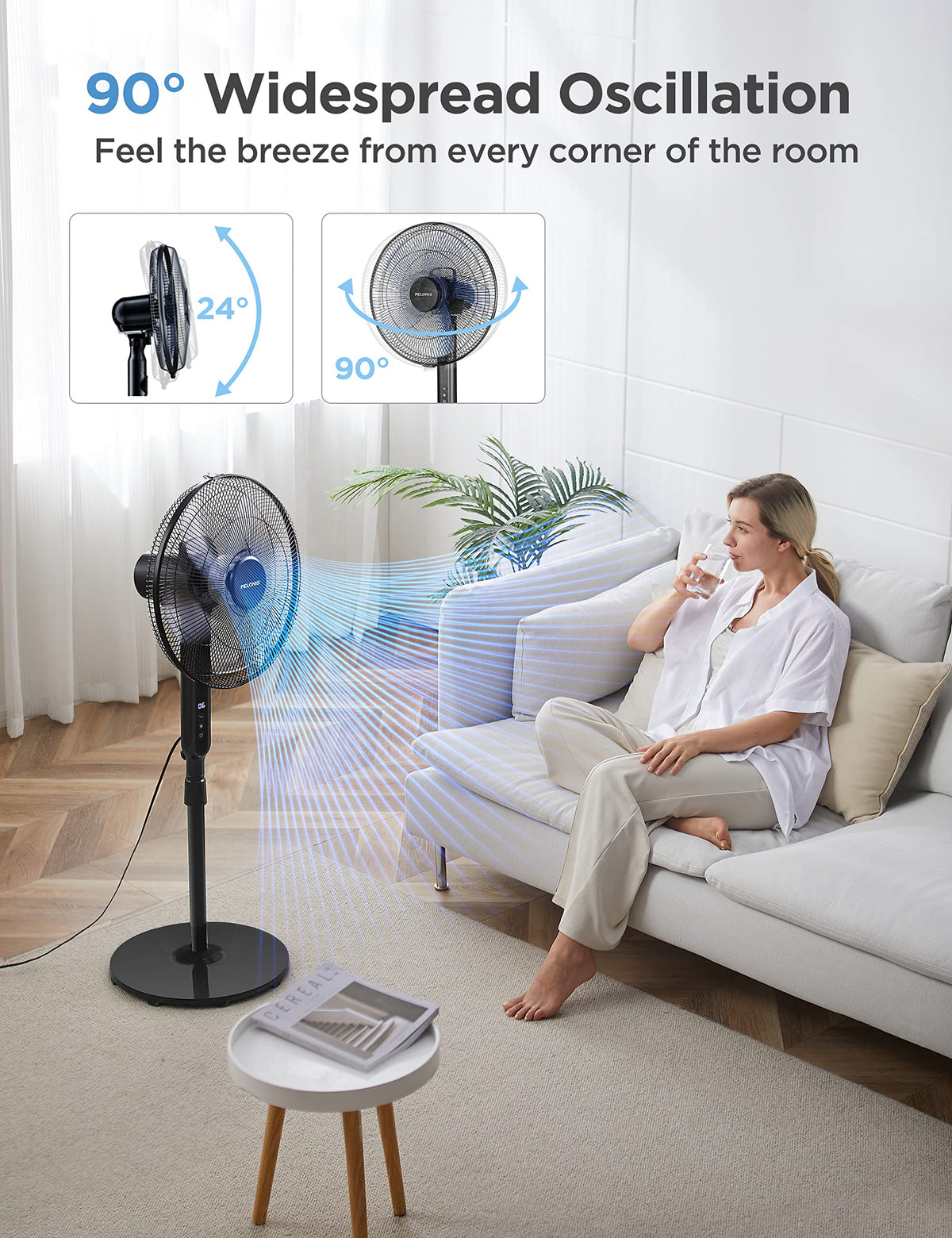 Pelonis 16'' Oscillating Pedestal Stand Up Fan | Adjustable Height | Ultra Quiet Dc Motor | Remote Control | 12 Speed | 12 Hour