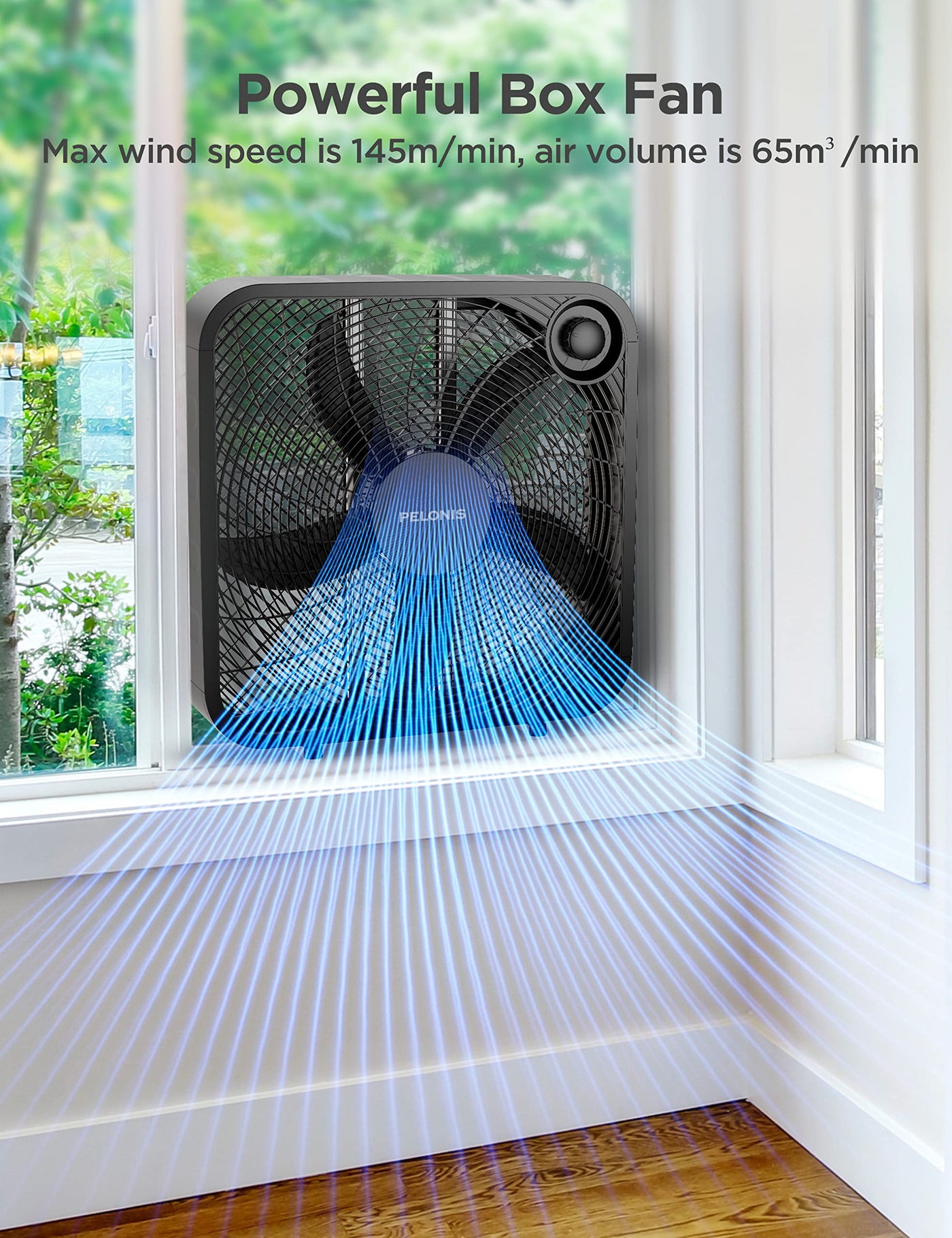 Pelonis 3 Speed Box Fan For Full Force Circulation With Air Conditioner, Upgrade Floor Fan, Black, Medium