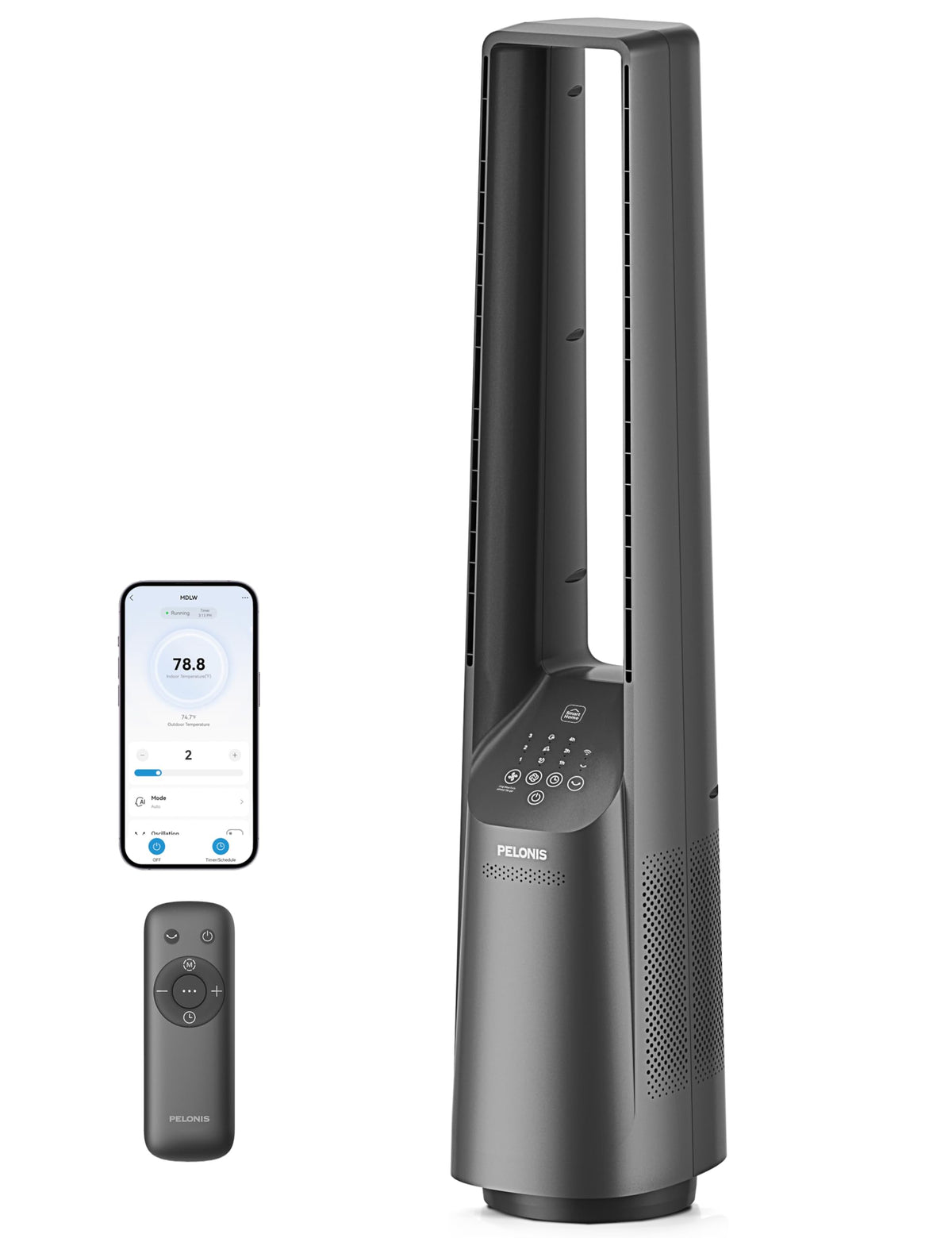 Q: Can I control the PELONIS 40" Smart Bladeless Tower Fan with my smartphone?A: Yes, the fan features Smart App Control and is compatible with Google Assistant and Alexa. You can adjust settings, set timers, and monitor performance directly from your smartphone.