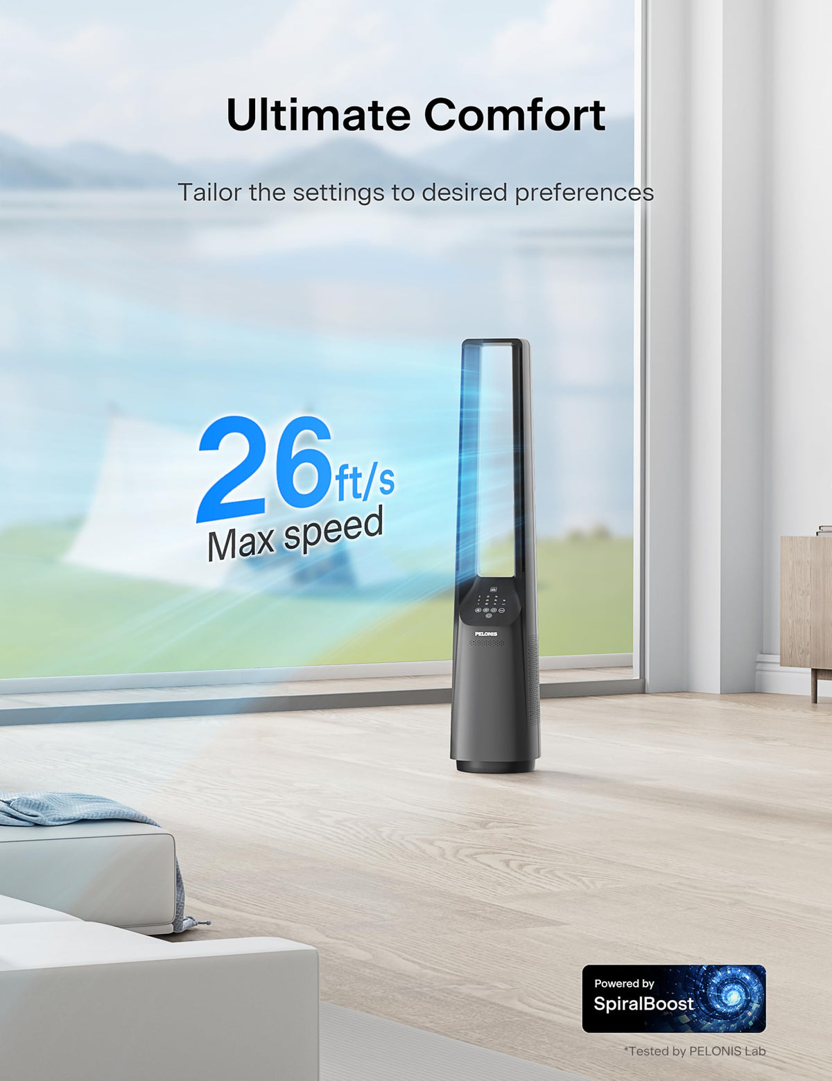 Q: What are the airflow specifications for the PELONIS 40" Smart Bladeless Tower Fan?A: The fan delivers 1200 CFM of smooth, gentle airflow, providing a consistent and refreshing breeze that helps maintain a comfortable temperature throughout the day.