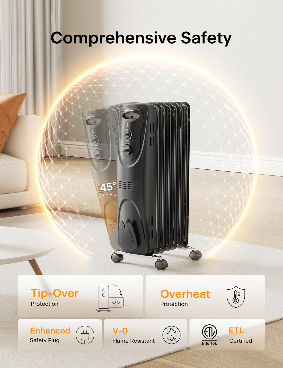 Pelonis Oil Filled Radiator Heater For Indoor Use Large Room Safe With Thermostat, 1500W Energy Efficient Quiet Space Heater, 3