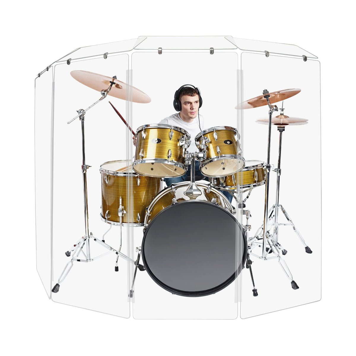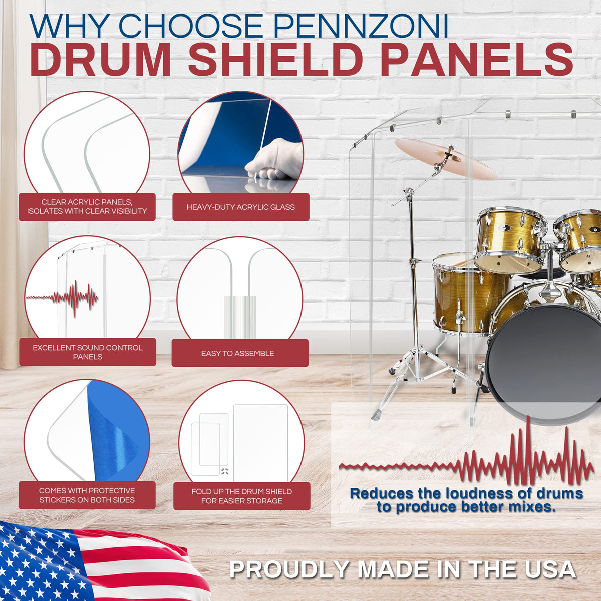 Why Choose The Pennzoni Drum Shield 1.) 100% Made In The Usa 2.) Clear Acrylic Panels, Isolates With Clear Visibility 3.) Made Of Premium-Quality Acrylic Glass 4.) Excellent Sound Control Panels 5.) Plastic Hinges That Hold Panels Firmly 6.) Easy To Assemble 7.) Comes With Protective Stickers On Both Sides 8.) Total Height Of 6Ft. Including The Deflector Panels.