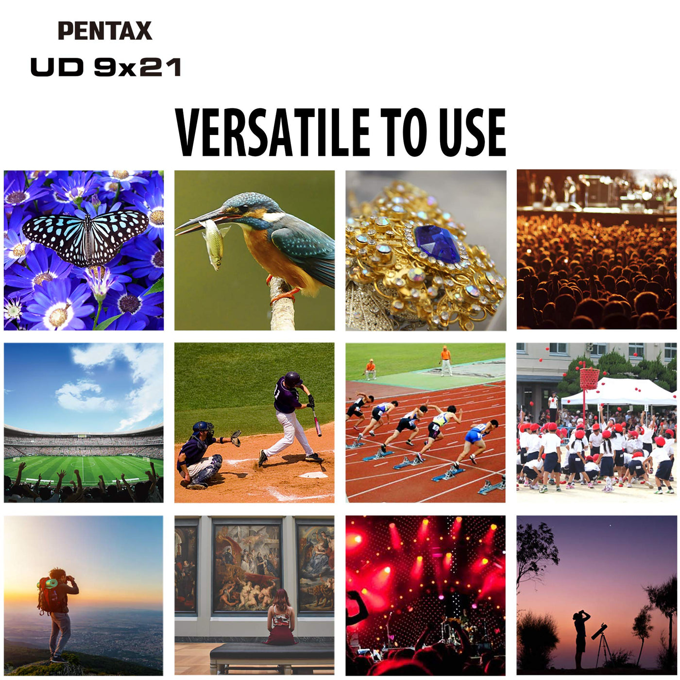 Q: What are the key features of the PENTAX Binoculars UD 9x21?A: The PENTAX Binoculars UD 9x21 feature a lightweight body with a roof prism design, fully multi-coated optics for a bright and clear field of view, and 9x magnification, making them ideal for concerts, sports events, and travel.