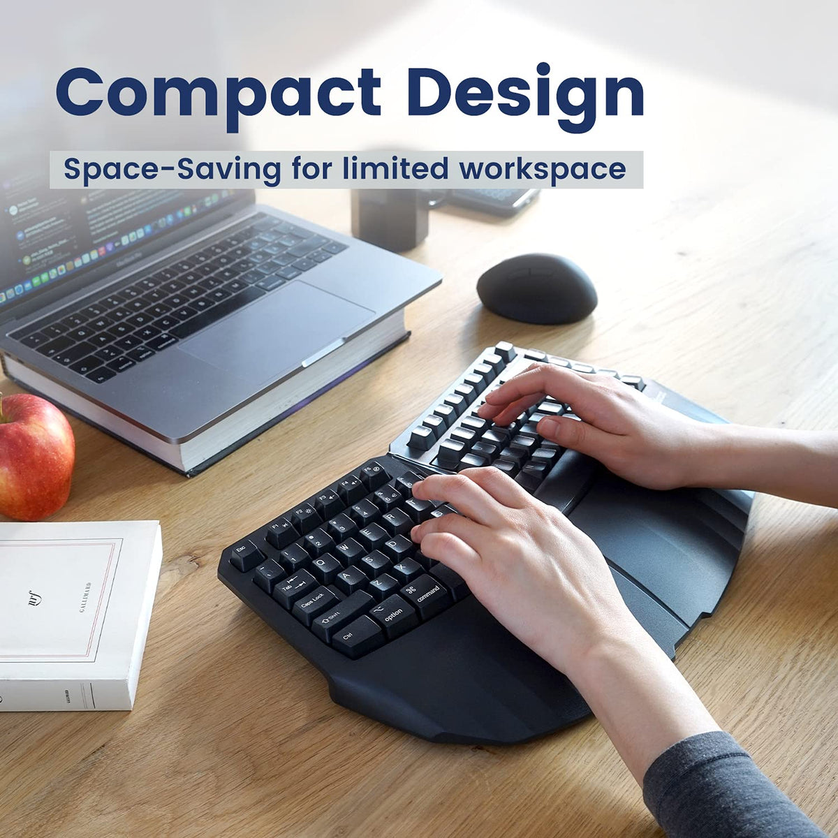 Q: What features make the Perixx PERIBOARD-413B ergonomic?A: The keyboard features a curved, split-key design that promotes a natural arm and hand position while typing, minimizing discomfort in the shoulders, wrists, and forearms.