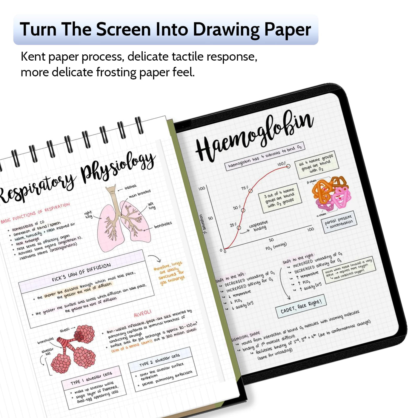 Q: What are the benefits of using this screen protector for drawing and writing?A: This screen protector simulates the feel of writing on real paper, enhancing your drawing and writing experience. With its advanced AG anti-glare technology and a self-developed anti-blue light filter, it offers a natural tactile sensitivity while protecting your eyes from strain.