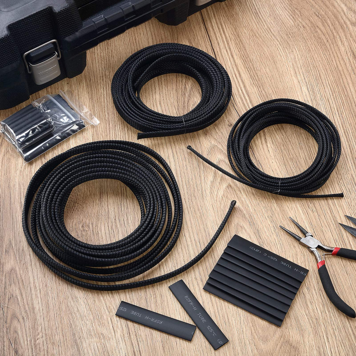 Q: What materials are used in the cable sleeve and heat shrink tubes?A: The cable sleeve is made from durable Polyethylene Terephthalate (PET), which is fire-resistant and flexible. The package also includes 127 heat shrink tubes designed for secure cable management.