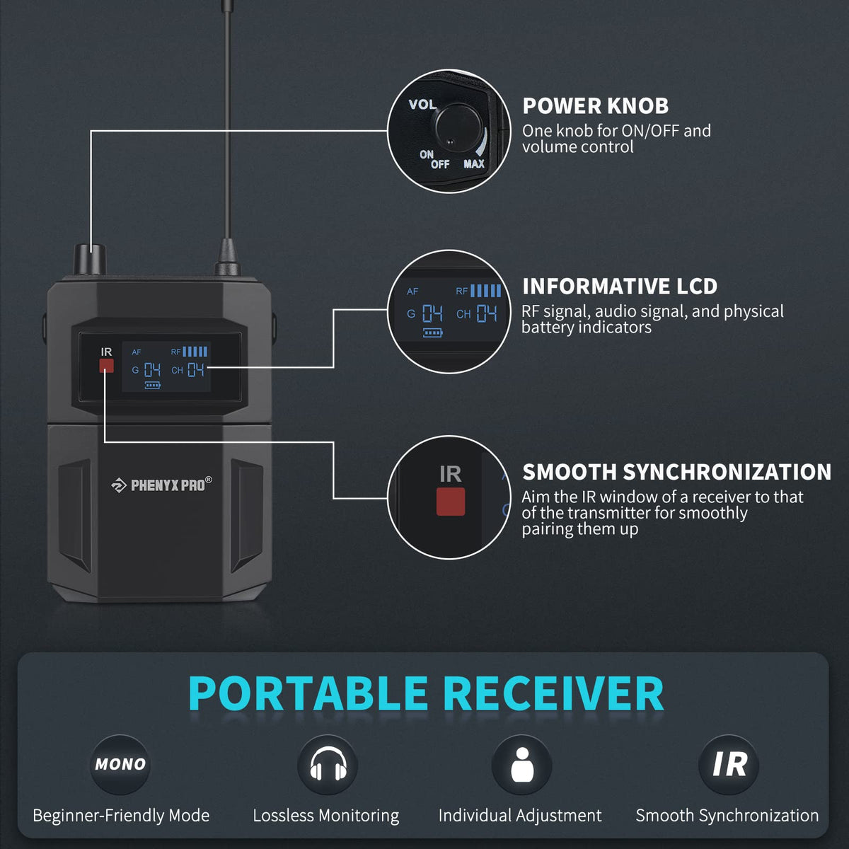 [Mono Monitoring & Hassle-Free Setup]: The Uhf In Ear Monitor Produces Crystal-Clear Sound Monitoring In Mono Mode And Enables You To Monitor Overall Sound Harmony From Various Instruments And Singers Effectively, A Beginner-Friendly Wireless In Ears For Singers And Stage Performances. The Hassle-Free Ir Synchronization To Pair Up Transmitters And The Receiver Makes Setup A Piece Of Cake.