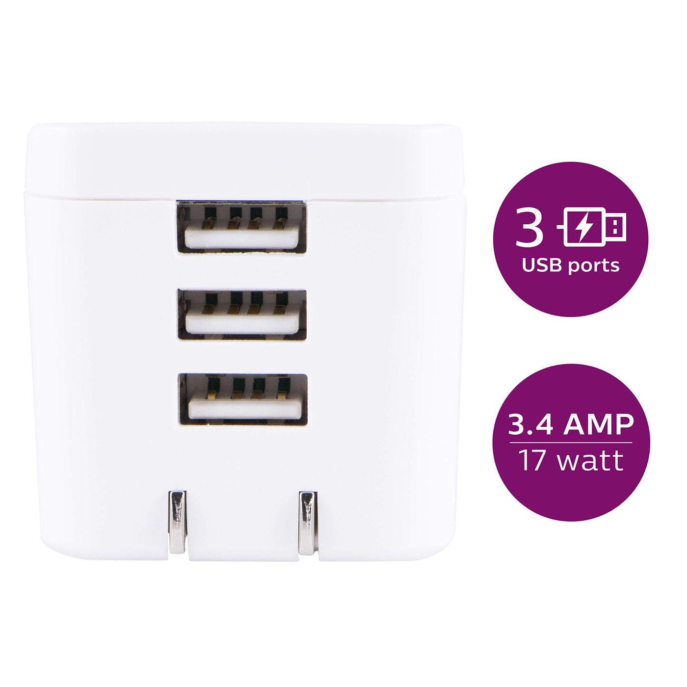 Take Charge Of Your Day With A Philips Triple Usb Wall Charger Featuring Three Standard Usb Ports The Wall Charger Creates A Multi-Purpose Charging Station For Your Smartphones Tablets And More With A Charging Rate Of 17W The Built-In Usb Ports Reduce The Need For Multiple Adapters Providing A Neat Organized Area For Connecting All Your Devices