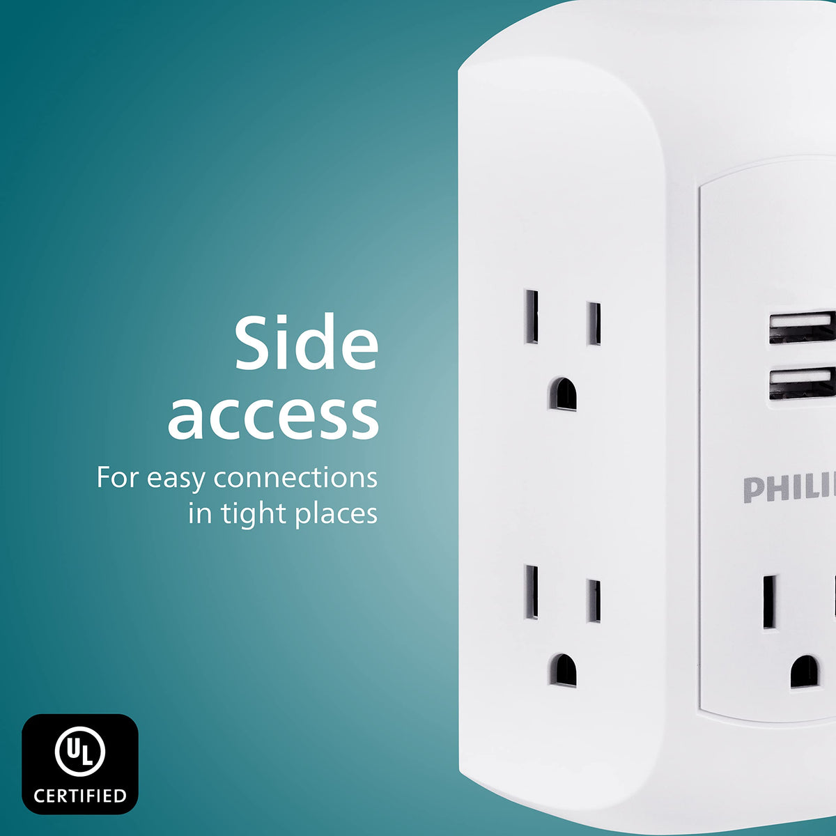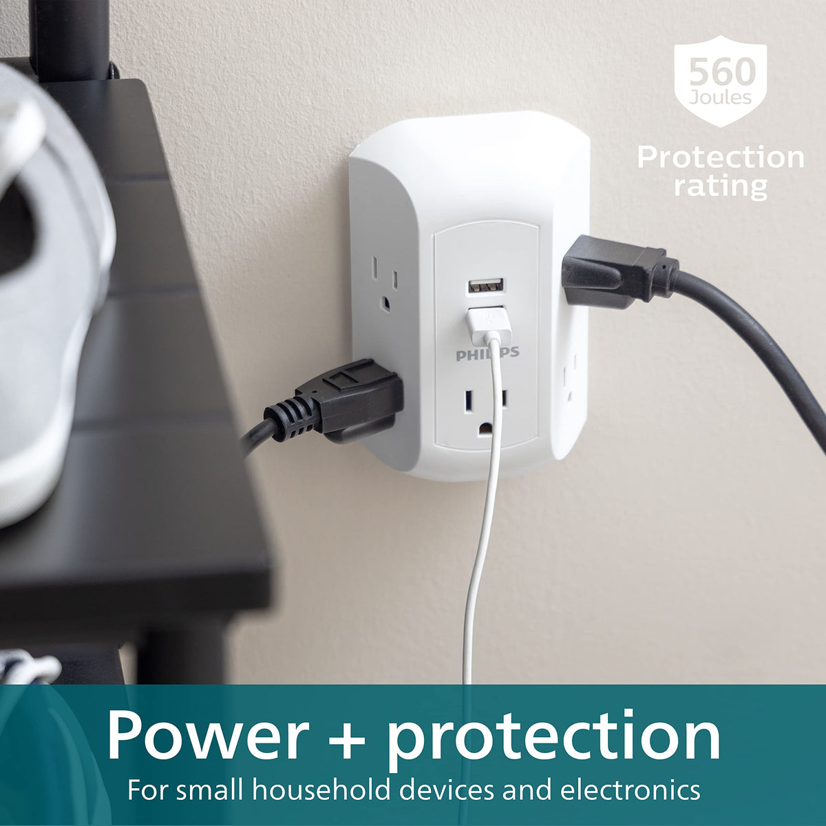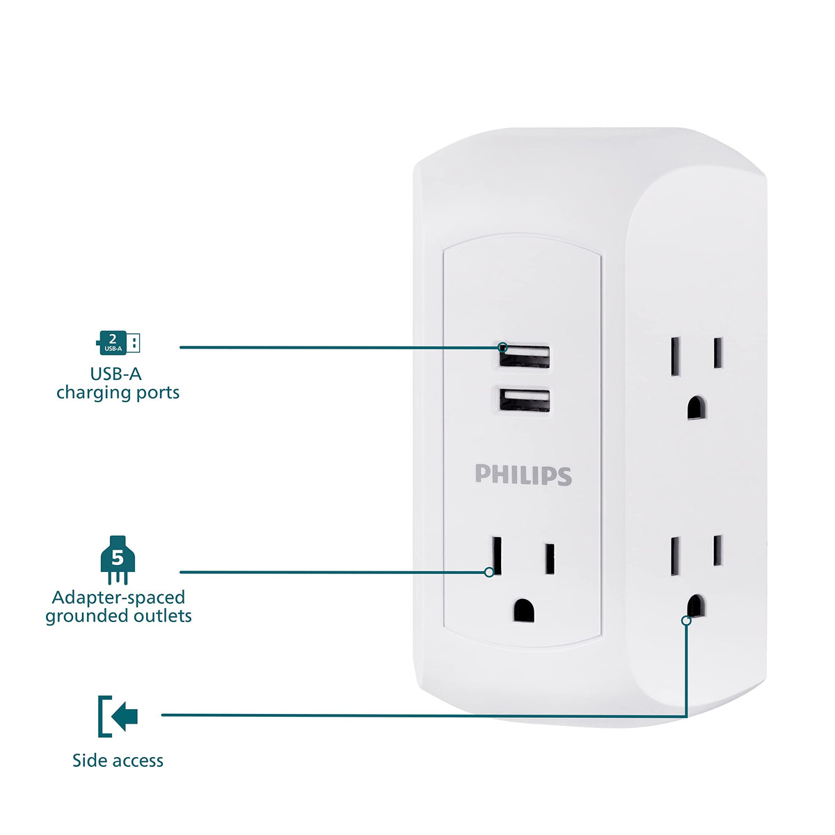 Increase Both Your Connectivity And Your Usb Charging Capability With The Philips 5-Outlet Usb Charging Surge Protector. Featuring Five Adapter-Spaced Outlets With 560 Joules Of Surge Protection, The Surge Protector Transforms Your Regular Outlet Into A Versatile, Efficient Powering Station. Two Built-In Usb-A Ports Offer 2.4A/12W Of Charging Power For Smartphones, Tablets And Mobile Devices. Just Plug The Surge-Protected Outlet Extender Into A Standard Grounded Three-Prong Receptacle, And Youre Ready To Go. Of The Five Protected Outlets, Four Feature Side-Access Design For The Ultimate In Convenience. Whether Its Your Home Office, Entertainment Center Or Workspace, Get The Most From Your Outlet With A Philips 5-Outlet Usb-Charging Surge Protector.