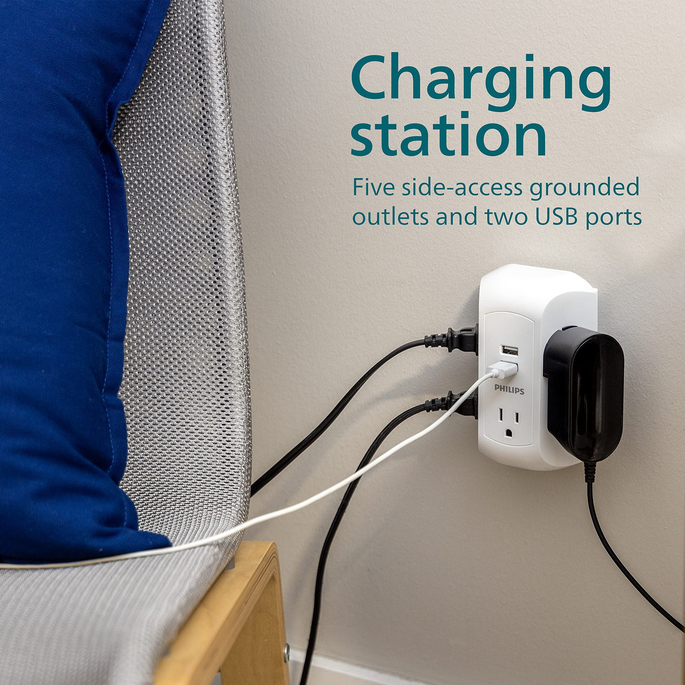 Philips 5 Outlet Extender, Grounded Wall Tap, 3 Prong, 2 Usb A, Surge Protector, Adapter Spaced Outlets, Side Access, 560 Joules
