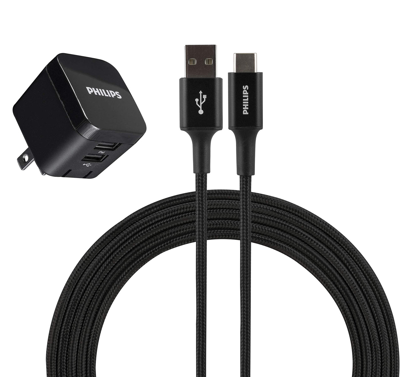 Philips Wall Charger Charging Kit, 2 Port, 12W, Usb A To Usb C, 6Ft Braided, For Iphone 12/11/Pro/Max/Xs/Xr/X/8, Ipad Pro, Samsu