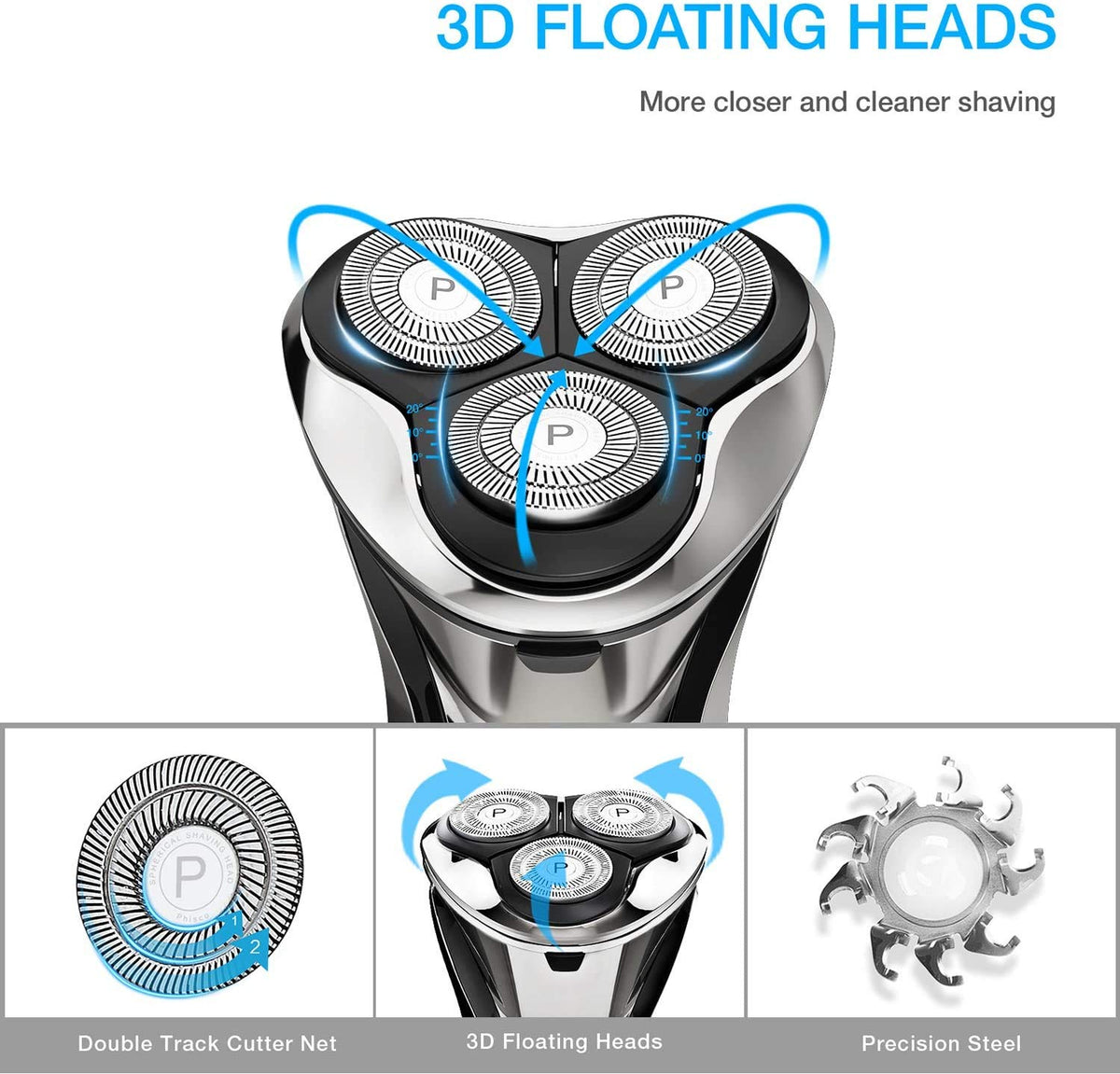 3D Razor Heads & Pop-Up Trimmer]: The Electric Razor Head Is Made By Double-Track Ultra Thin Spherical Cutter Net And Self-Sharpening Steel Blade, Increases The Wider Contact Surface Than Single Track, Delivers A More Smooth, Close And Sharp Shave It Can Float In 4 Directions And Automatically Adjust To Your Face, Neck, And Even The Contour Of The Jaw The Pop-Up Trimmer Easy One Push To Open, Perfect For Sideburns, Mustaches Wet And Dry, Ipx7 Waterproofthe Electric Shaver Has An Ipx 7 Waterproof Rating Therefore, You Can Enjoy It With Gel Or Foam In The Shower To Get A Better Shaving Effect In Addition, It Is Very Convenient To Clean Under Running Water Usb Charging & Led Display]: It Takes 1 Hour To Fully Charge The Electric Shaver Through The Usb Cable, And It Can Be Used For 120 Minutes Of Shaving The Usb Data Cable Is Very Portable For Charging, Allowing You To Charge Your Electric Shaver Anytime, Anywhere The Led Digital Display Can Inform You Of The Percentage Of Remaining Power For You To Check Convenient And Suitable For Your Daily And Travel Use Intelligent System When The Battery Is Low, The Led Display Of The Electric Shaver Razor For Men Will Prompt You To Charge When The Electric Razor For Men Is In Use, The Remaining Available Time Will Be Displayed On The Display Screen When The Electric Razor Appears A Small Faucet Icon On The Body Reminds You To Clean The Electric Razor When You Press And Hold For 3 Seconds Which Will Lock The Electric Razor To Prevent Accidental Touch Quality After-Sales Service Your Satisfaction And Comfort Are Our Greatest Affirmation If You Dont Like This Mens Electric Shaver For Any Reason, Please Feel Free To Tell Us, We Will Provide You With A 100% Satisfactory Solution Within 24 Hours The Product Has A One-Year Warranty