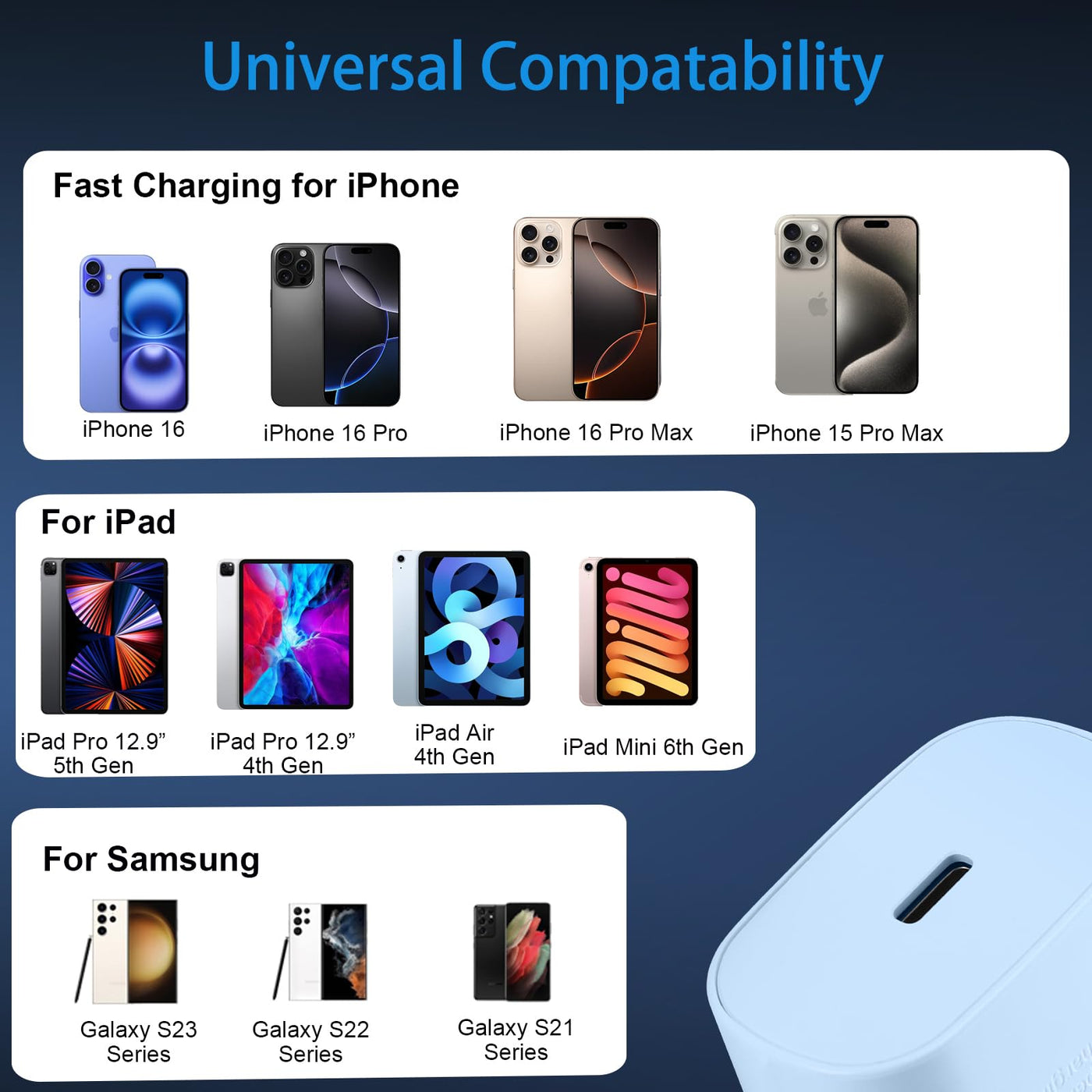 Q: What devices are compatible with the 30W USB C Phone Charger?A: The 30W USB C Phone Charger is compatible with various devices including the iPhone 16, 15, and their Pro models, iPad Pro 12.9" and 11", as well as Samsung Galaxy S24, S23, S22, and many other USB-C devices.