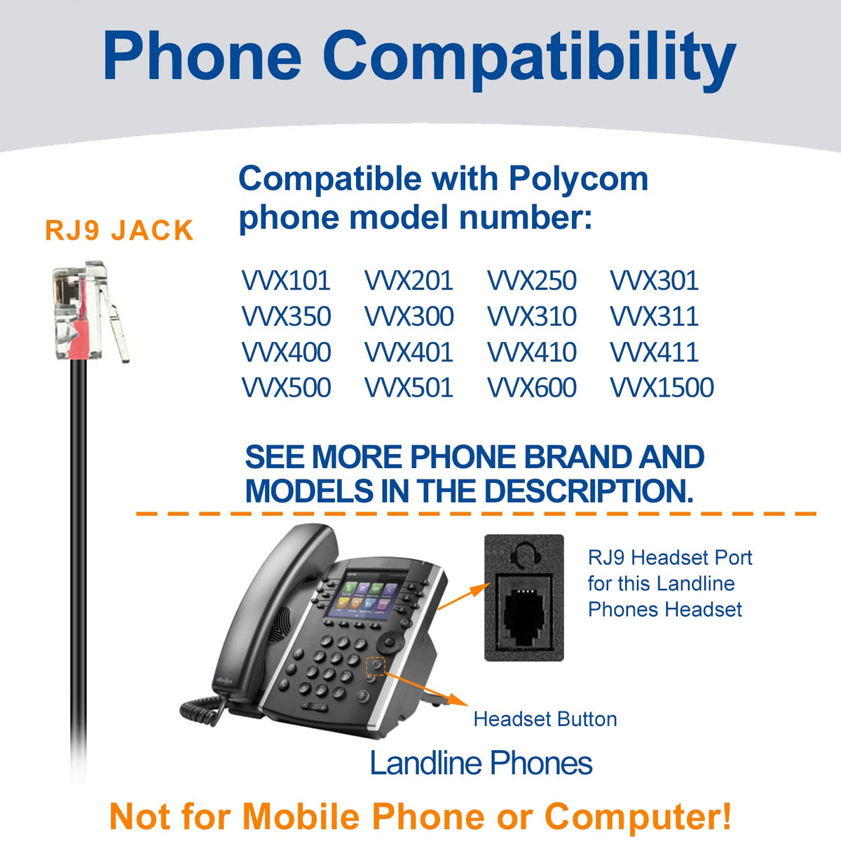 This Telephone Headset Only Comes With Rj9 Jack. It Only Works For Landline Phones. Not For Cell Phone And Computer. Attention: This Rj9 Phone Headset Doesnt Come With 2.5Mm Jack, 3.5Mm Jack Or Usb Jack. Compatible Phone List (Include But Not Limited): Do Not Buy The Item If You Cant Find Your Phone Model In Lists, Consult Us For Compatibility Advice. If Your Phone Is Avaya, Kindly Contact Us For Compatibility Checking Before Purchasing. It Is Only Compatible With Some Specific Avaya Phone Models Listed In Description. Compatible With: Compatible With Polycom: Vvx101 Vvx201 Vvx250 Vvx301 Vvx350 Vvx300 Vvx310 Vvx311 Vvx400 Vvx401 Vvx410 Vvx411 Vvx500 Vvx501 Vvx600 Vvx1500 Soundpoint 300 301 335 430 450 500 (Rev. E Or Later) 501 550 600 601 650 670 Cx300 Cx500 Cx600 Cx700. Not For Polycom Phone Soundpoint 321 331 331C Pro Se-220 Se-225. Shoretel: Ip100 Ip212 212K Ip230 Ip265 Ip530 Ip560 560G Ip565 Ip565G Ip655 420 480 480G 485 Nortel: 1100 1120 1140 1165 1210 1220 1230 Allworx: 9204 9212 9222 9224 Aastra: 2465 2564 480 480E 480I 51I 53I 55I 57I 57Ict 554 564 565 I733 1120E 1140E 1150E 1210 1220 1230 I2002 I2004 I2004 Ip I2004 Phase Ii I2052 7406 8540 9617 6730I 6731I 6739I 6751I 6753I 6755I 6757I 6757I Ct 7446I 9112I 9133I 9116 9143I 9480I M2216 (Acd I Or Acd Ii) M3905 M4000 M4020 M7208 M7308 M7310 M7316 M7324 M4000 M4020 M5208 M5209 M5216 M5317 M7900 M8001 M8003 M9009 M9516 Powertouch 480 480E 480I Telephones I2002 I2004 I2004 Ip (Not Compatible With I2400 Phase Ii And I2004 Poe Phones) Dialog 4222 4223 4224 4225 Toshiba: Dkt-3001 Dkt-3010S Dkt-3014Sdl Dkt-3020S Dkt-3020Sd (Must Have Toshibabheu Adapter For On Hook Answering Sold By Toshiba Not Available From Us) Strata Cix Dp5022F-Sd Dp5023-Sd Dp5018-S Dp5000-Series Avaya / Lucent: 6402D 6408D+ 6416D+M 6424D+M 8403 8410D 8434Dx 4406D+ 4412D+ 4424D+ 4424Ld+ 1120 1140 1165 1210 1220 1230 1408 1416 2410 2420 4610 4610Sw 4612 4620 4620Sw 4621 4621Sw 4622 4622Sw 4625 4625W 4630 4630Sw 5410 5420 5610 5620 5621 5625 9404 9406 9408 9504 9508 Dt1 Dt3 Dt5 Qe4610 Note: Not Compatible With Avaya: J139 J169 J179 And 1608 1616 9608G 9611G 9620 9621G 9630 9640 9640G 9641G 9650 16Cc Ip Phones (Doesnt Work)