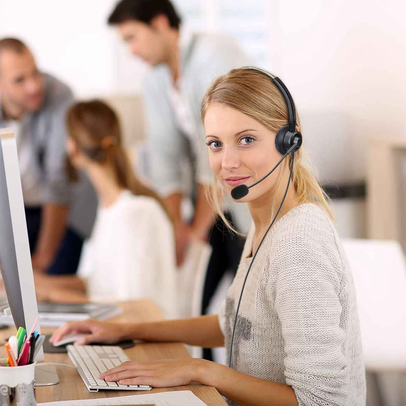 Q: What features make this headset suitable for long hours of use?A: The headset is designed for comfort with a lightweight build and an adjustable headband, along with soft leatherette ear cushions that provide all-day wearing comfort, making it ideal for extended use in office environments.
