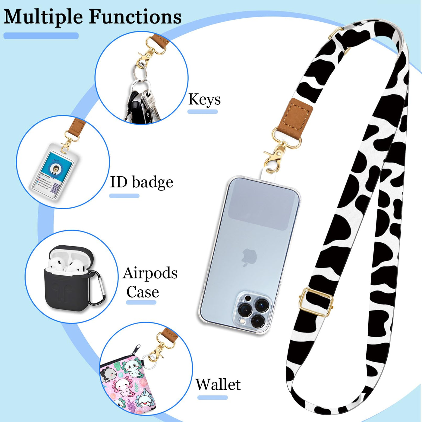 Phone Lanyard Crossbody Wrist Strap Adjustable, Cow Cell Phone Lanyard Wristlet Universal Phone Strap With 2 Phone Tether Tabs, Cute Neck Lanyard For Women Iphone Case Id Badges Cell Phone Accessories