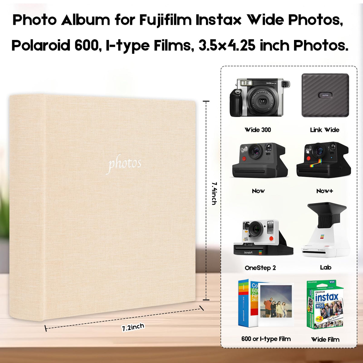 Veicevol Photo Album For Fujifilm Instax Wide 300 Camera, Linen Cover, 120 Pockets Photo Album With Writing Space For Polaroid Now Onestep2 Onestep+ Instant Camera, Pop Lab Print Camera