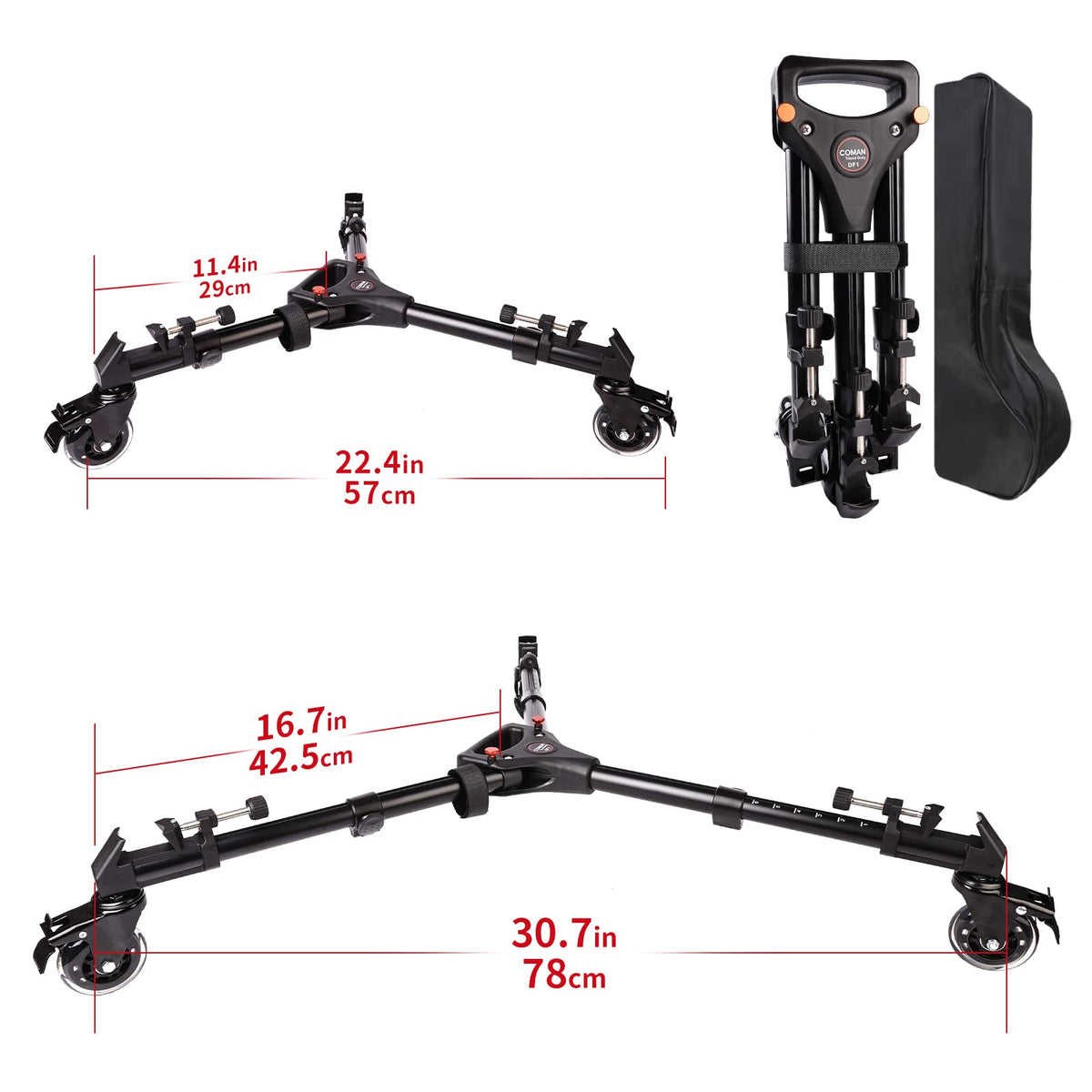 Introducing The Coman Photography Tripod Dolly, A Heavy-Duty And Wide Compatible Solution For Smooth Movement Of Your Tripod Or Light Stand. This Dolly, With Its 3-Inch Durable Rubber Wheels And Individual Brakes, Ensures Stability And Easy Mobility. The Adjustable Clamps Securely Lock Any Size Of Tripod Foot, Making It A Perfect Companion For Most Tripods. The Legs Extend From 11.8 Inches To 17.3 Inches, Accommodating Tripods Of Various Dimensions. Lightweight, Portable, And Easy To Use, This Dolly Features A Folding Design, Carry Handle, And A Carry Bag For Added Convenience During Outdoor Photography. The Product, Weighing 1.5 Kilograms, Can Carry A Maximum Weight Of 33.07 Pounds. Made Of Strong Yet Lightweight Aluminum Alloy And Rubber, It Reflects Comans Commitment To Quality, Reliability, And Customer Satisfaction.