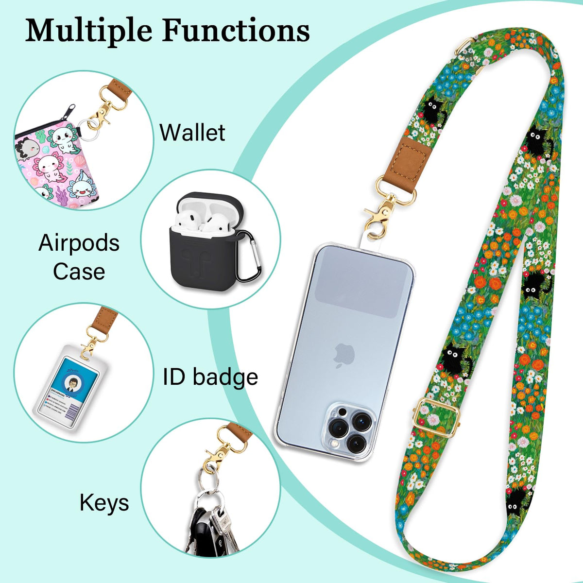Q: What are the main features of the Piefly Phone Lanyard?A: The Piefly Phone Lanyard features a unique design with black cat and flower patterns, made from premium soft materials for comfort. It includes an adjustable crossbody lanyard, a wrist strap, phone tether tabs, and key rings, making it versatile for various uses.