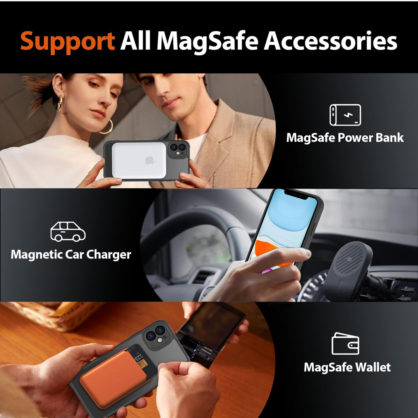 Q: How does the magnetism of this case work?A: The built-in N52SH magnet has 2400GS of attraction, securely attaching to magnetic accessories like car mounts and MagSafe wallets for added convenience.