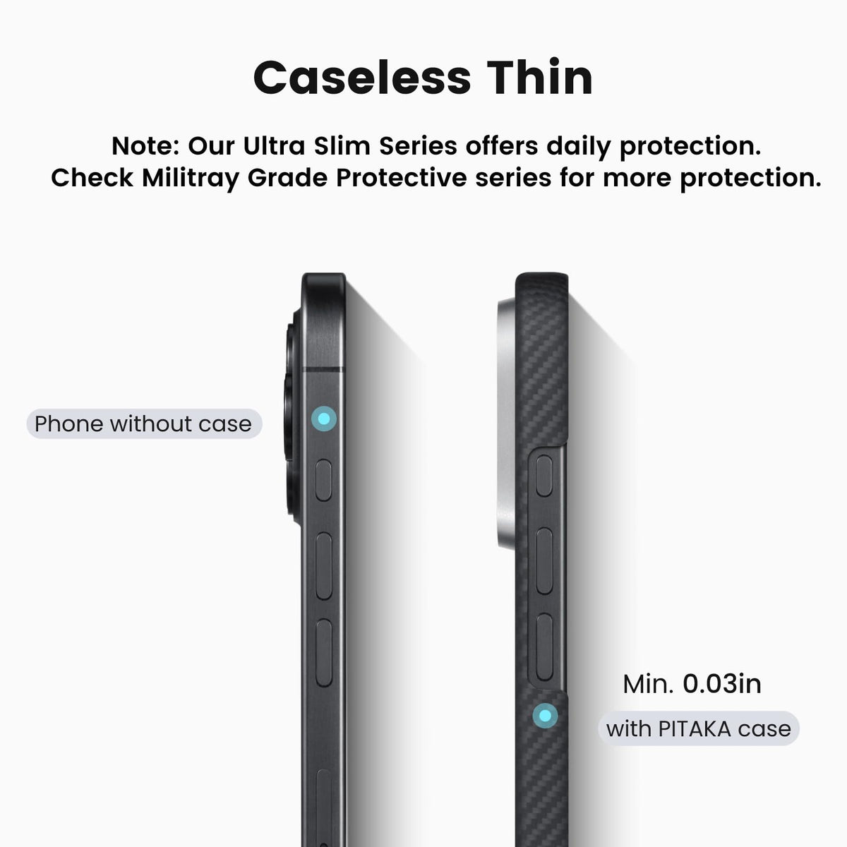 Q: How slim is the PITAKA case for iPhone 16 Pro Max?A: The PITAKA case is designed to be ultra-slim and lightweight, crafted using Amber Magnet Film technology. It maintains the sleek profile of your iPhone 16 Pro Max while providing essential daily protection.