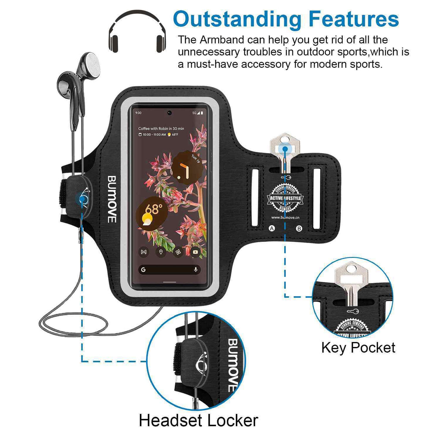 Q: Can I use headphones while wearing the BUMOVE Gym Armband?A: Absolutely! The design of the BUMOVE Gym Armband allows for easy access to all phone ports, making it simple to connect headphones while you are on the go.